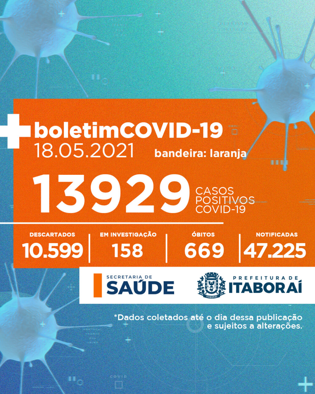 [18-05-2021] - BoletimCOVID19A Secretaria Municipal de Saúde de Itaboraí informa que a cidade se encontra na bandeira laranja, risco moderado de contágio de Covid-19, tendo registrado até essa data 47.225 notificações.