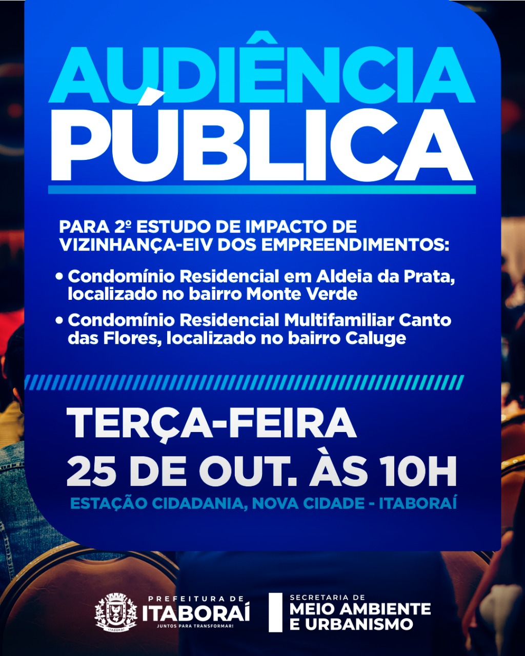 A audiência pública será referente ao Condomínio Residencial Aldeia da Prata, no bairro Monte Verde, e o Condomínio Residencial Multifamiliar Canto das Flores, localizado na Estrada Ademar Ferreira Torres, no bairro Caluge.