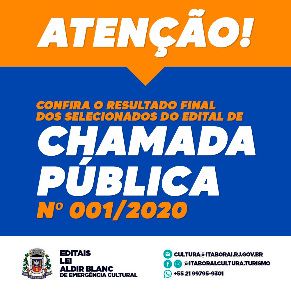 O SECRETÁRIO MUNICIPAL DE EDUCAÇÃO, CULTURA E TURISMO no uso das suas atribuições legais torna pública RELAÇÃO FINAL DOS SELECIONADOS conforme o item 1.6 da errata 001/2020 – Chamada Pública nº 001/2020 Credenciamento de artista e profissionais da cultura para apresentações em plataformas digitais – Alteração do cronograma – Processo Administrativo No 2989/2020 – Chamamento Público ao Setor Cultural para atendimento às ações emergenciais a serem adotas durante o estado de calamidade pública reconhecido pelo Decreto Legislativo nº 6, de 20 de março de 2020, nos termos da legislação vigente, especialmente a Lei no 14.017, de 29 de junho de 2020.Noticias em Destaque