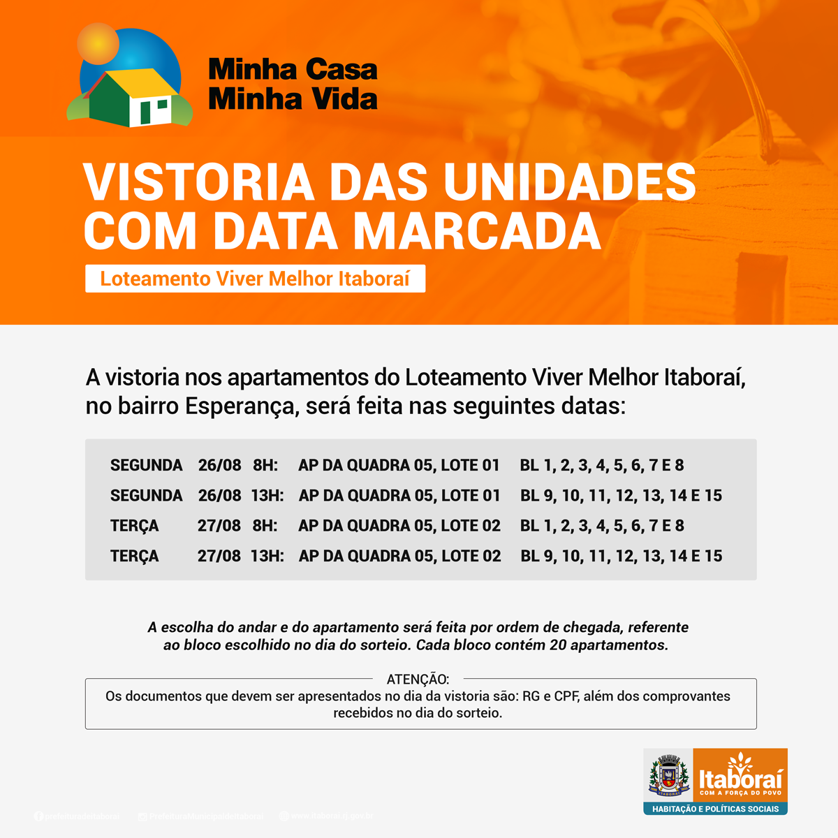 A vistoria nos apartamentos do Loteamento Viver Melhor Itaboraí, no bairro Esperança, será feita na próxima segunda e terça-feira (26 e 27 de agosto). Lembrando que a escolha do andar e do apartamento será feita por ordem de chegada, referente ao bloco escolhido no dia do sorteio. Cada bloco contém 20 apartamentos.
