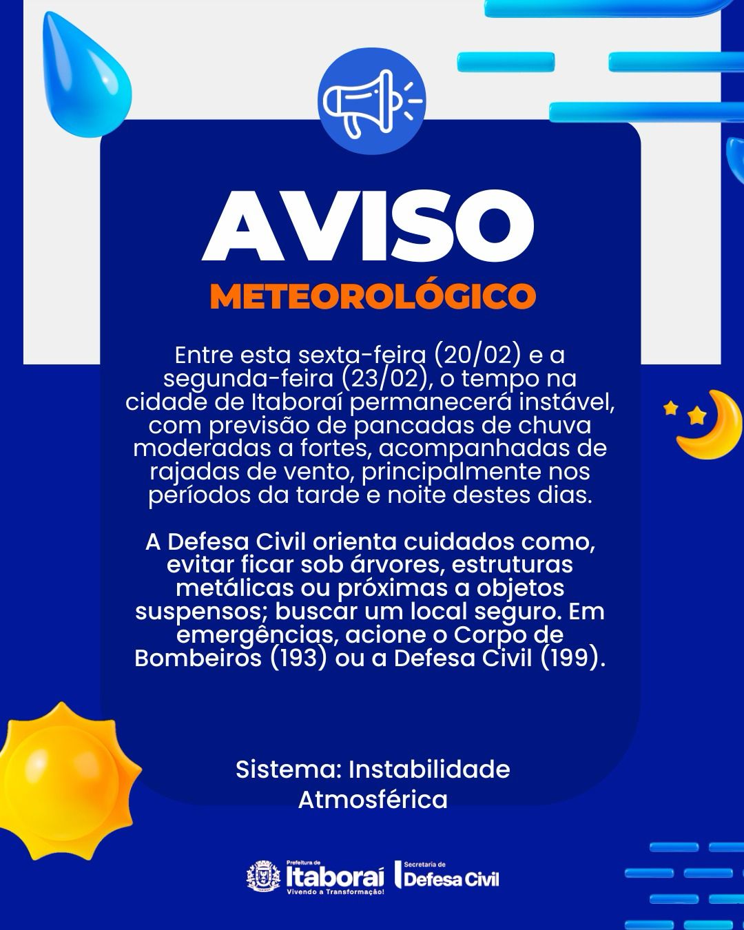 A Prefeitura de Itaboraí, por meio da Secretaria Municipal de Defesa Civil, informa que, entre esta sexta-feira (20/02) e a próxima segunda-feira (23/02), o município deverá registrar instabilidade atmosférica, com previsão de pancadas de chuva moderadas a fortes, acompanhadas de rajadas de vento.
