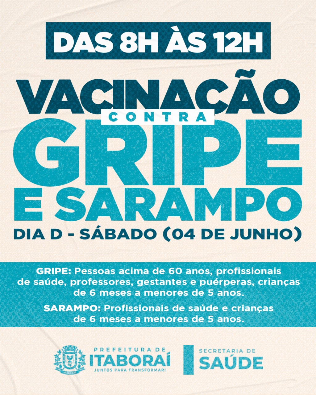 A Prefeitura de Itaboraí, por meio da Secretaria Municipal de Saúde (SEMSA), realiza o Dia D Estadual contra a Influenza e Sarampo, neste sábado (04/06). A ação será realizada em 32 polos de vacinação no município, das 8h às 12h.
