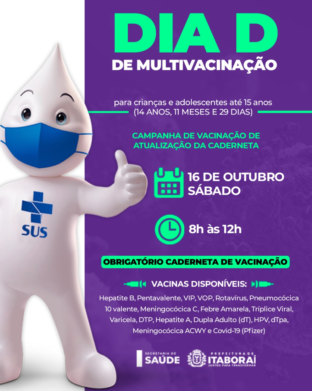 Com o objetivo de atualizar a caderneta de vacinação de crianças e adolescentes menores de 15 anos (14 anos, 11 meses e 29 dias), a Campanha Nacional de Multivacinação acontece nas Unidades Básicas de Saúde (UBS) do município até o dia 29 de outubro. Para intensificar o compromisso de manter em dia a vacinação desse público-alvo, a Secretaria Municipal de Saúde (SEMSA) divulgou que, no próximo sábado (16/10), será realizado o Dia D em 30 postos de saúde de Itaboraí, de 8h às 12h.
