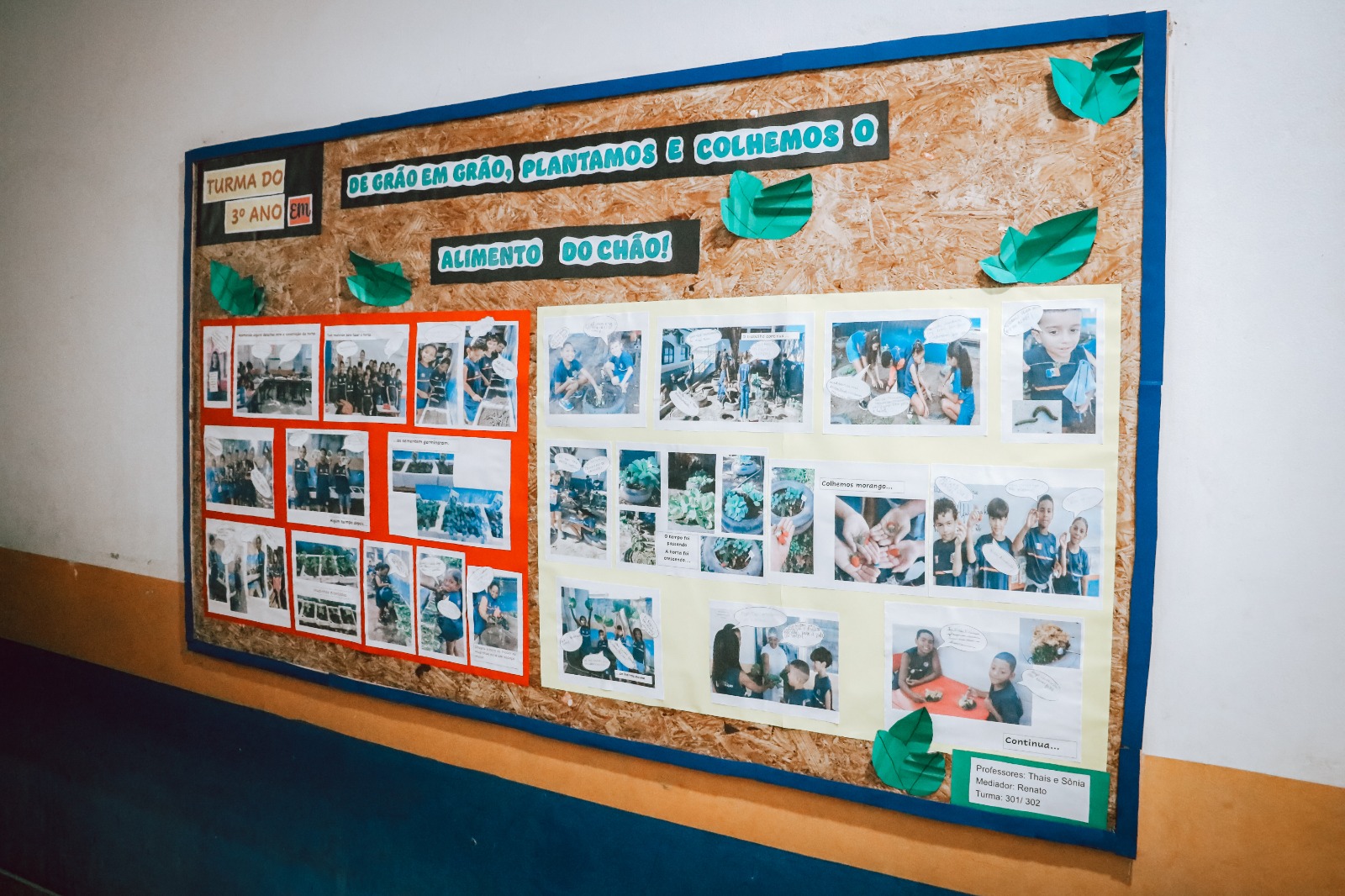 Durante a comemoração do Dia das Crianças, os alunos também puderam visitar uma exposição no corredor da escola com trabalhos inspirados no projeto da horta e no homenageado da Feira do Livro de 2025, o autor Maurício de Sousa.