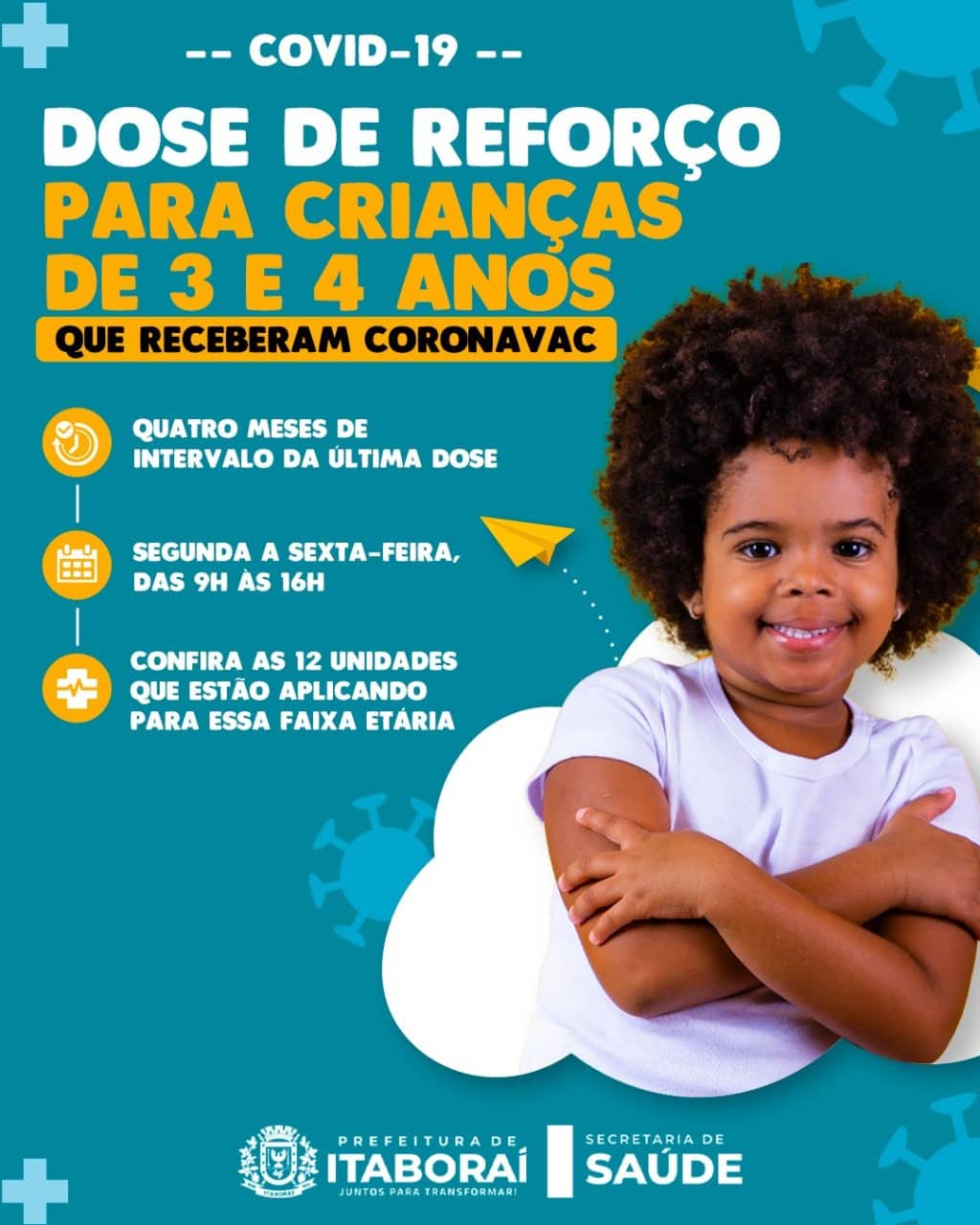 Crianças de 3 e 4 anos de idade, que receberam a vacina Coronavac no esquema primário, e que tenham 4 meses da última dose, já podem tomar a dose de reforço da vacina contra a Covid-19 no município. A imunização acontece em 12 unidades de Saúde espalhadas pela cidade, de segunda a sexta-feira, das 9h às 16h.