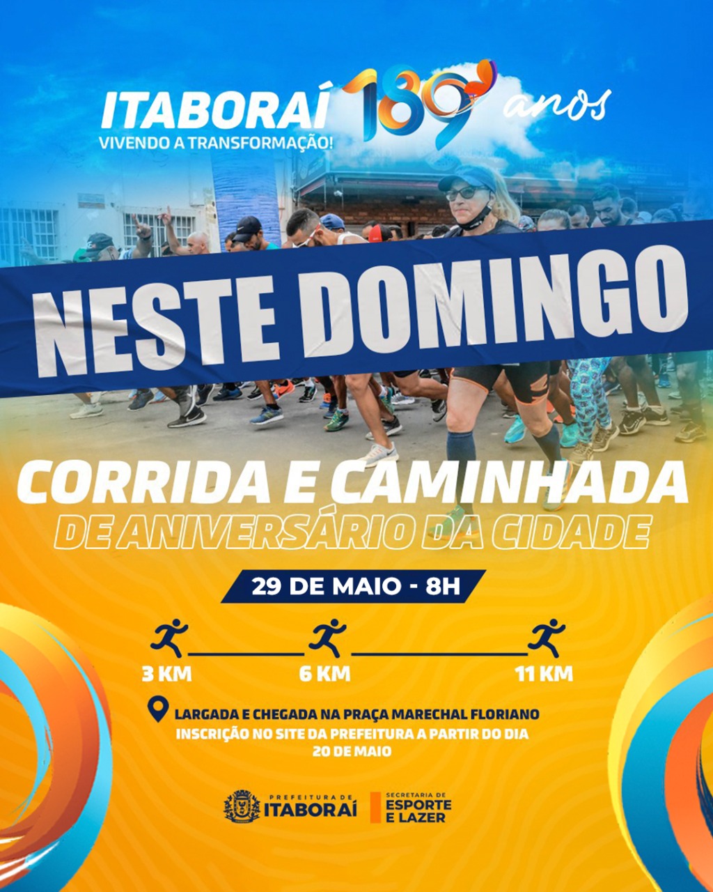 Também no domingo (29/05), com início às 8h, acontece a tradicional Corrida e Caminhada pelo aniversário da cidade, uma parceria da Secretaria Municipal de Esporte e Lazer (SEMEL) com o 35º Batalhão de Polícia Militar. A largada será na Praça Marechal Floriano Peixoto, no Centro, e os inscritos poderão fazer o percurso de 3km, 6km ou 11km, com chegada também na Praça.