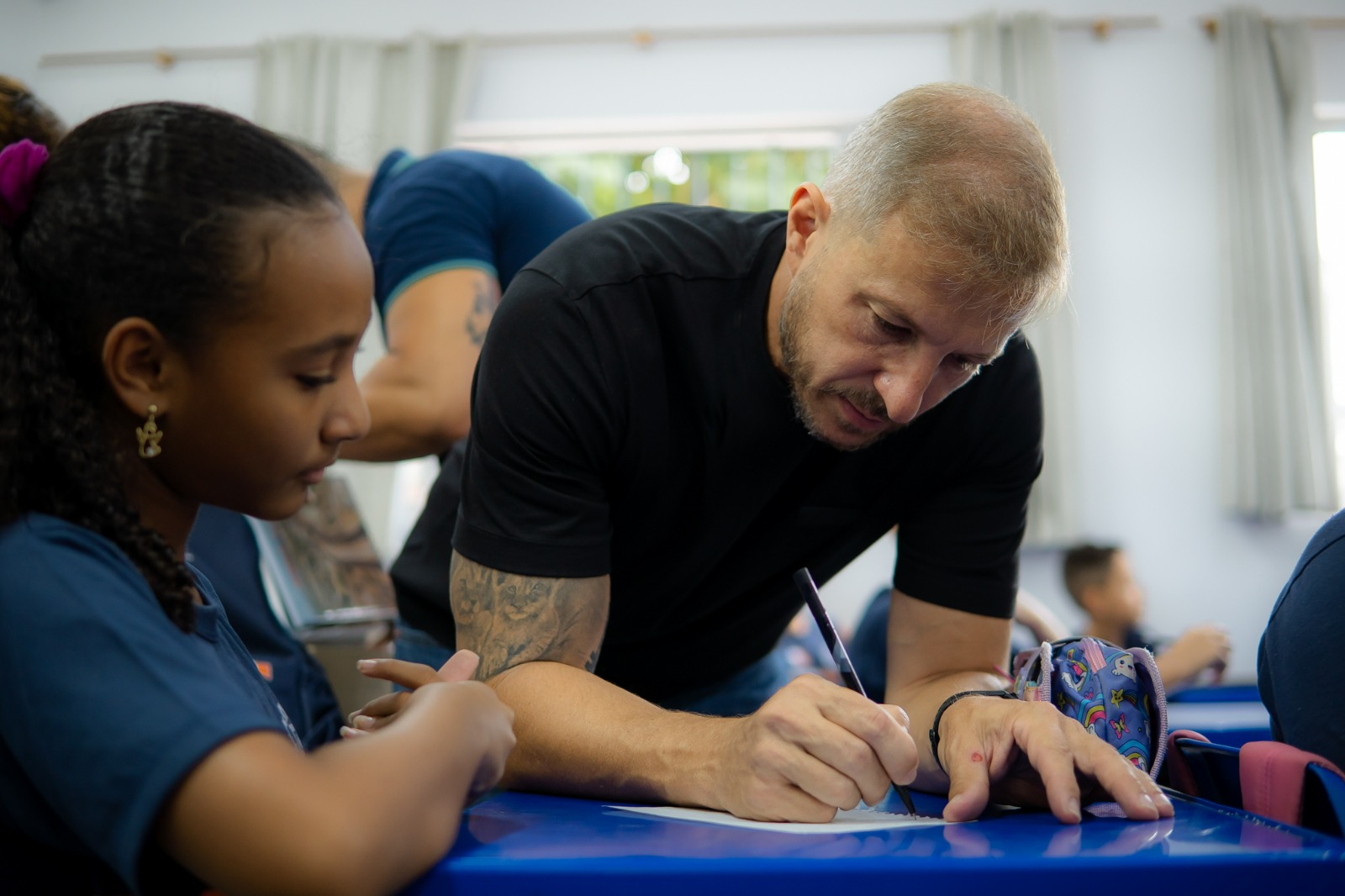 Acompanhado do secretário municipal de Educação, Mauricilio Rodrigues, e do presidente da Câmara Municipal, João Delaroli, o prefeito percorreu diferentes turmas, interagiu com os estudantes e encerrou a visita de forma descontraída, participando de uma partida de futebol com as crianças na quadra da escola.