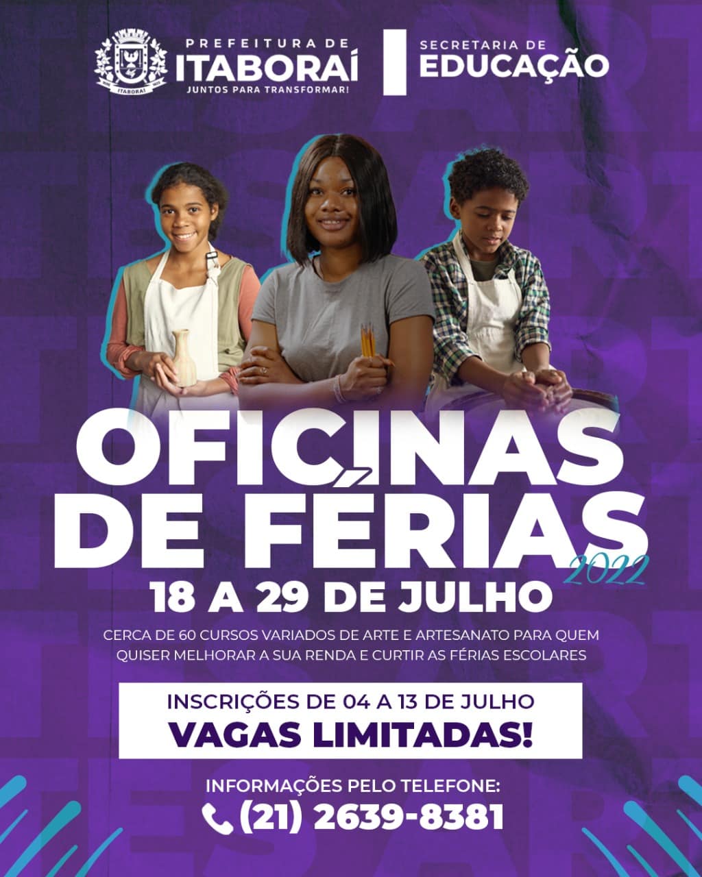 A Escola Municipal de Artes Professor Washington Luiz José da Costa, em Itaboraí, está com inscrições abertas até o dia 13 de julho para as oficinas gratuitas de férias. As inscrições podem ser feitas na própria unidade, das 8h às 17h, e cada pessoa poderá se inscrever em até dois cursos.