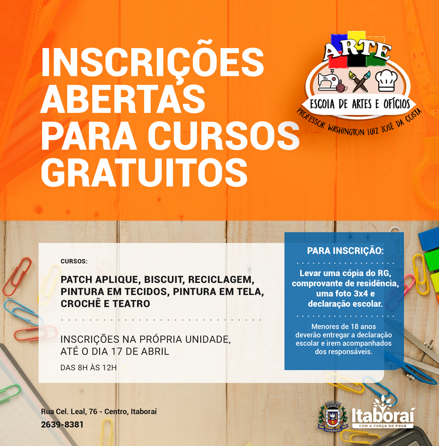 A Escola de Artes e Ofícios Professor Washington Luiz José da Costa, em Itaboraí, está com inscrições abertas para cursos gratuitos para toda população. As inscrições podem ser feitas na própria unidade, até o dia 17 de abril, das 8h às 12h.
