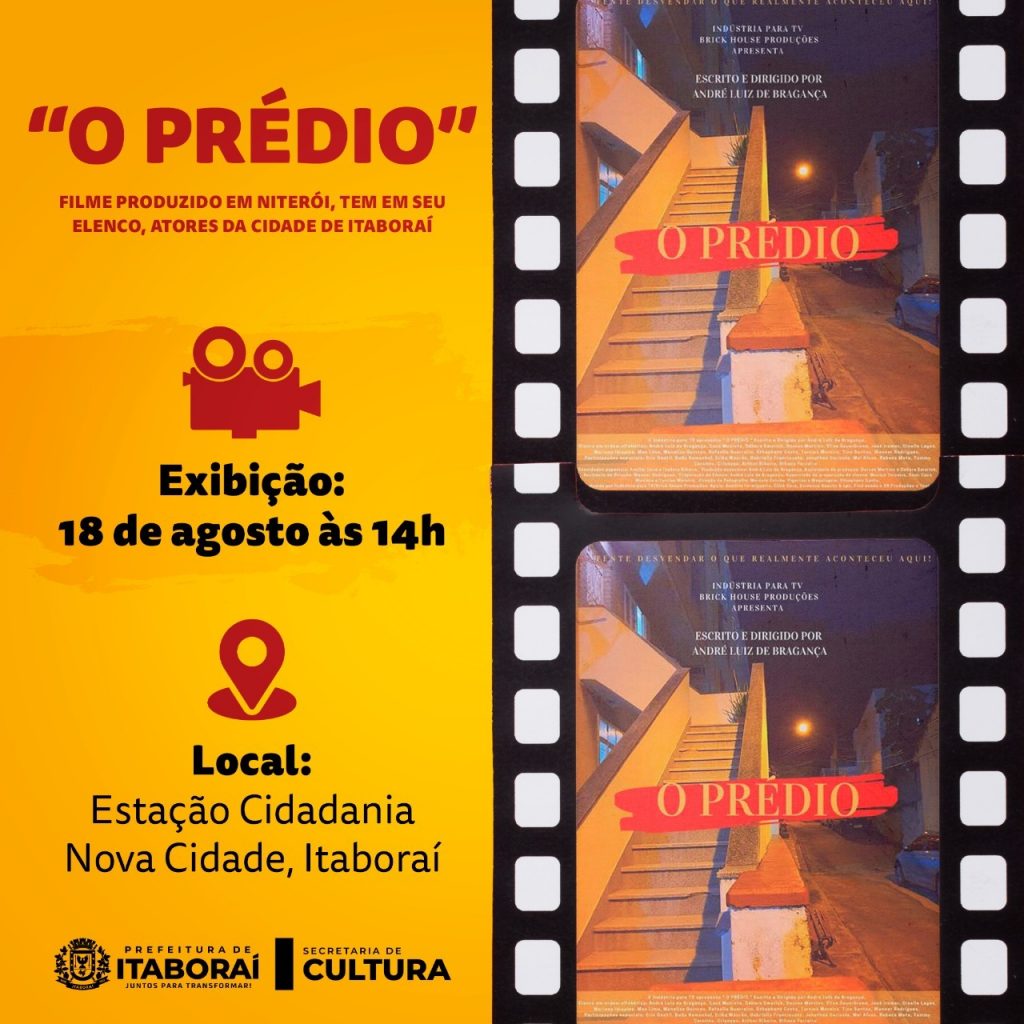 O filme “O Prédio”, que conta com atores de Itaboraí no elenco, terá exibição aberta ao público, na próxima quinta-feira (18/08), às 14h, no anfiteatro da Estação Cidadania, em Nova Cidade. Ao todo, serão disponibilizados 60 lugares, que serão preenchidos por ordem de chegada. A comédia policial é escrita e dirigida por André Luiz de Bragança.
