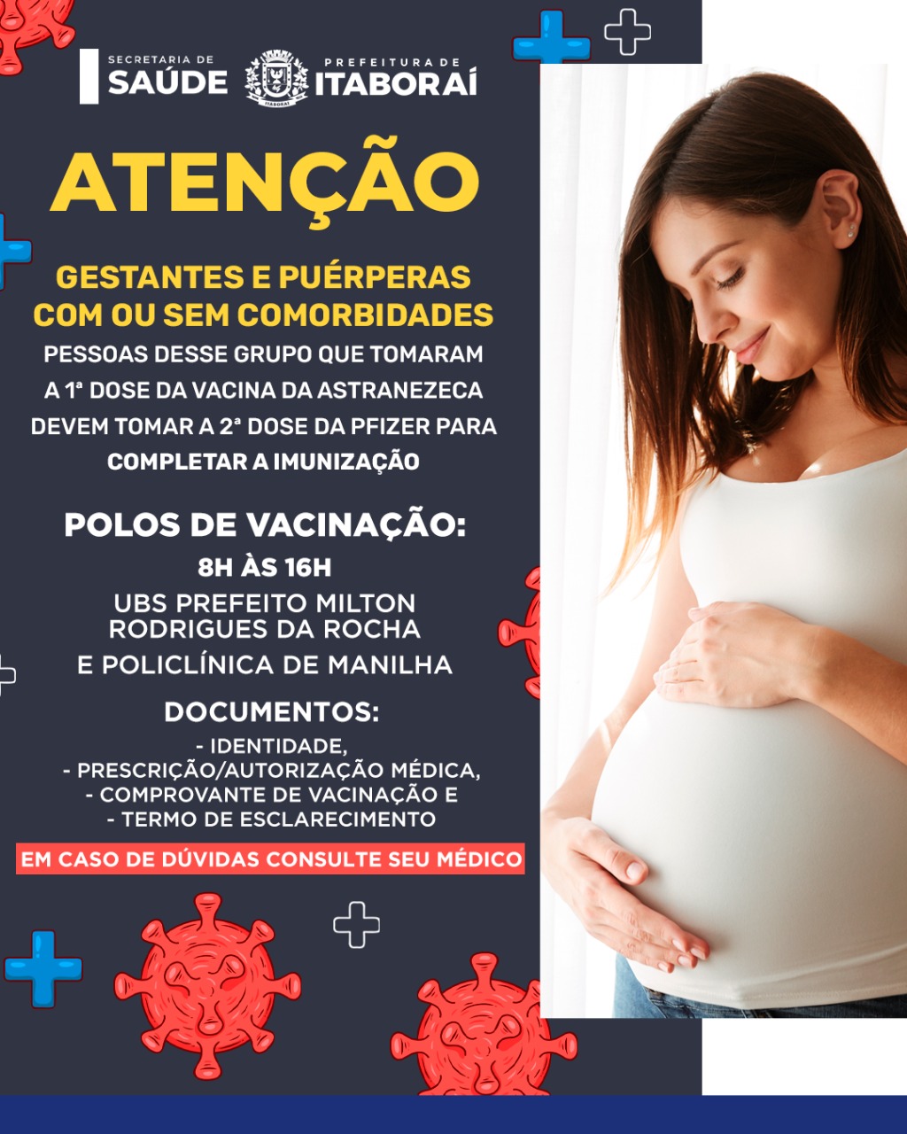 No início do mês de maio, a Prefeitura de Itaboraí suspendeu a vacinação da AstraZeneca/Fiocruz para gestantes e puérperas contra Covid-19, acatando imediatamente a recomendação da Agência Nacional de Vigilância Sanitária (Anvisa). Desde a determinação, este grupo prioritário tem recebido apenas as vacinas CoronaVac (Instituto Butantan/Sinovac) e Pfizer.