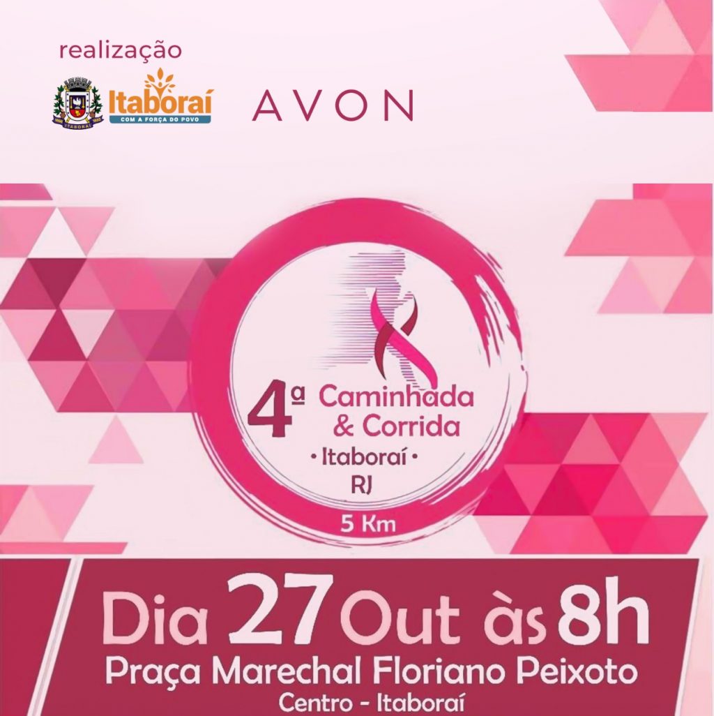 Visando conscientizar a população sobre a importância da prevenção do câncer de mama, o Instituto Avon, com apoio da Prefeitura de Itaboraí vai realizar no dia 27 de outubro uma corrida e caminhada contra o câncer, que faz parte da programação do outubro rosa. A largada, de um percurso de 5 km, acontece na Praça Marechal Floriano Peixoto, às 8h.