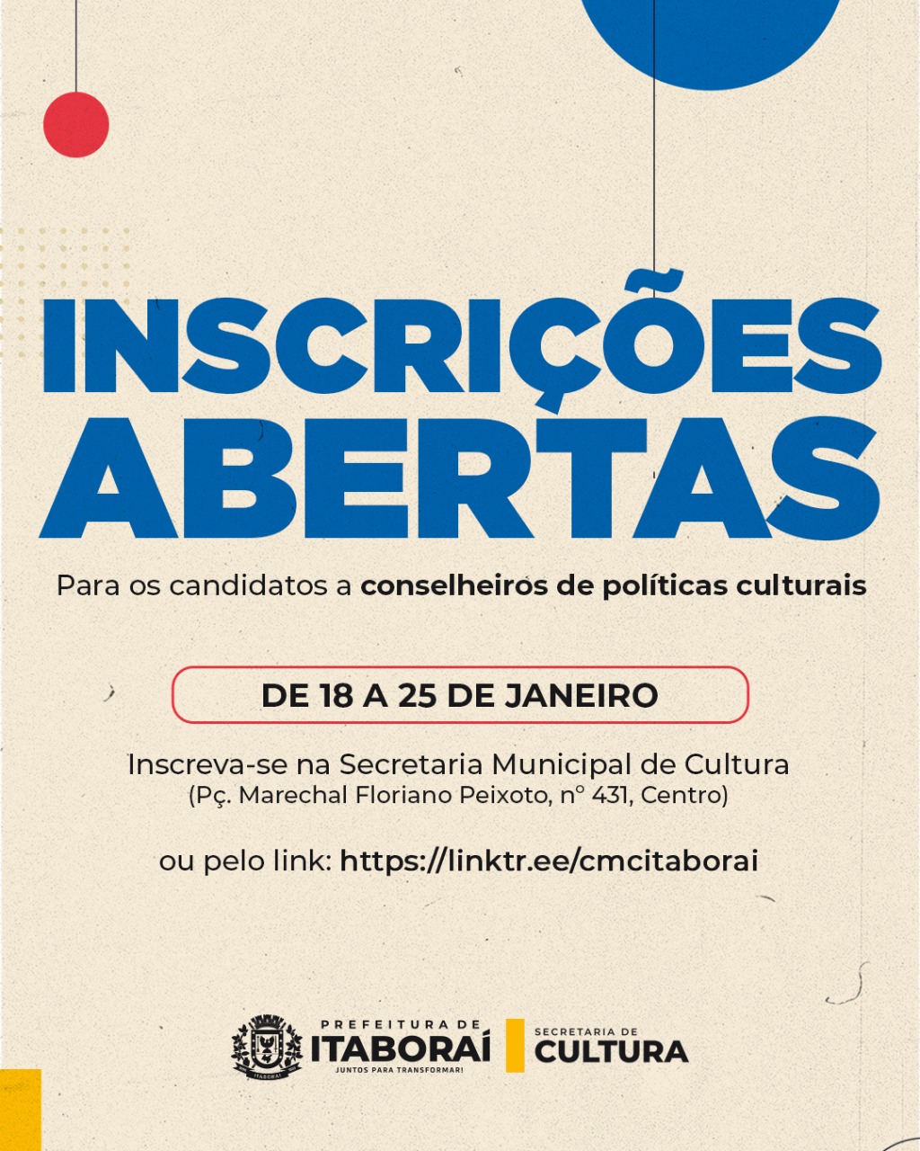A Secretaria Municipal de Cultura convoca os moradores de Itaboraí com mais de 18 anos e envolvidos com cultura no município, para participar do processo de eleição dos membros do Conselho Municipal de Política Cultural, para o biênio 2023/2025. A eleição, destinada aos representantes da sociedade civil, acontecerá na Estação Cidadania, em Nova Cidade, nos dias 2 e 9 de fevereiro, das 9h às 14h.