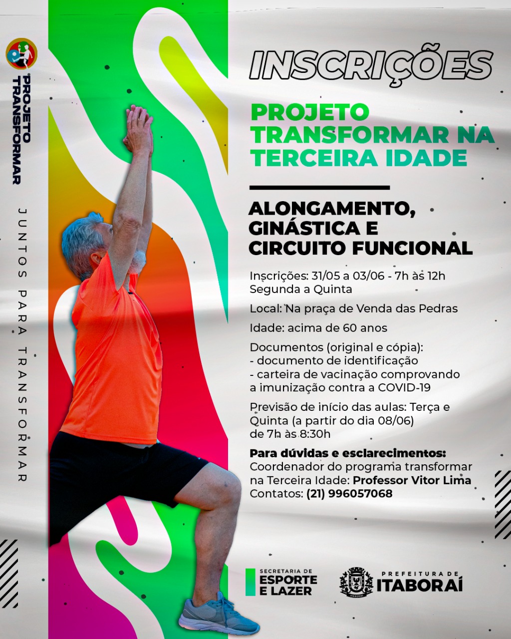 A Prefeitura de Itaboraí, através da Secretaria Municipal de Esporte e Lazer (SMEL), abrirá as inscrições para o projeto “Transformar para Idosos”, com objetivo de promover aulas gratuitas de alongamento, ginástica e circuito funcional na praça de Venda das Pedras, a partir do dia 8 de junho, sendo todas terças-feiras, das 7h às 8h30.