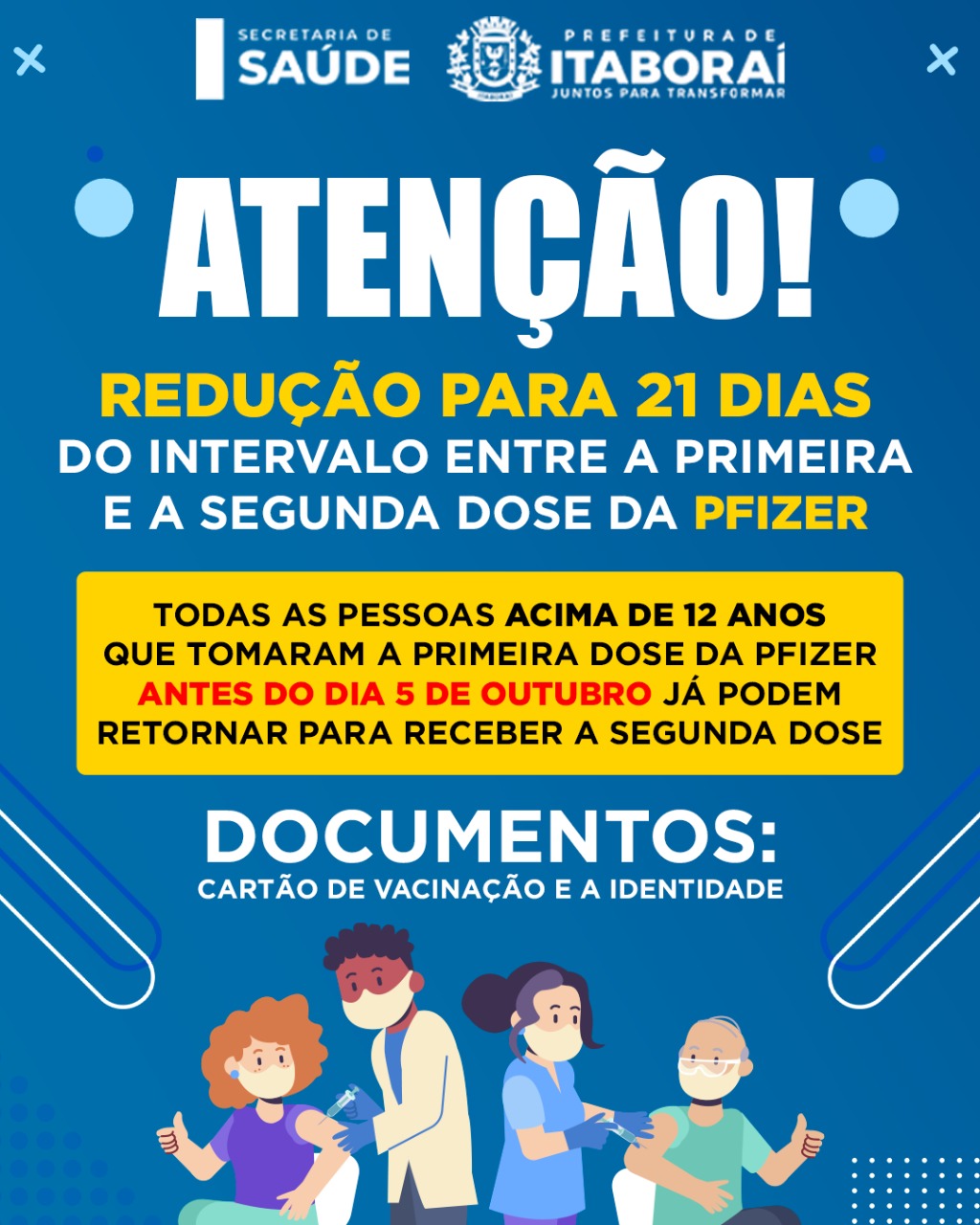 Portanto, o itaboraiense que recebeu a primeira dose da Pfizer antes do dia 5 de outubro já está autorizado a retornar às unidades de vacinação para tomar a segunda dose. De acordo com o superintendente de Vigilância em Saúde, Renato Botticini, a redução do intervalo entre as doses tem o objetivo de atingir principalmente o público-alvo adolescente, uma vez que foi autorizada a retomada gradual das atividades admitindo a presença de até 100% do número de alunos matriculados nas escolas.