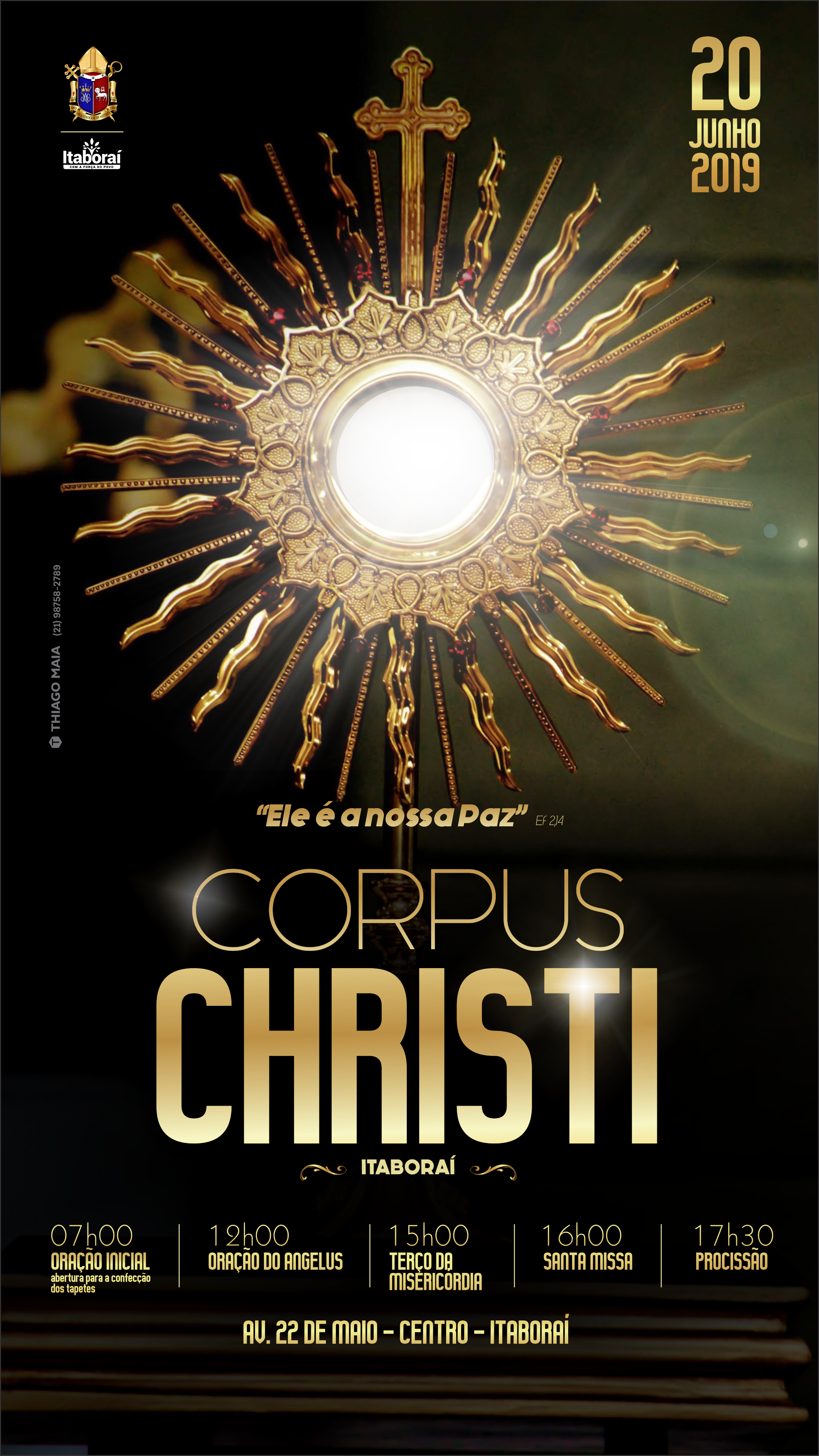 Corpus Christi (2)No próximo dia 20 de junho (quinta-feira), Itaboraí receberá a celebração da solenidade de Corpus Christi, um evento religioso da Igreja Católica que acontece todos os anos. Assim, a Avenida 22 de Maio, principal via de Itaboraí, no sentido Manilha, será tomada por aproximadamente 120 tapetes de sal. Para esta confecção dos tapetes terão uma média de 600 voluntários, divididos pelas quatro paróquias do município, a Paróquia de São João Batista, no Centro; São Pedro Apóstolo, em Venda das Pedras; Nossa Senhora de Fátima, em Manilha e Nossa Senhora da Conceição, Porto das Caixas. Além de escolas e comunidades católicas, com início às 7h e previsão de término às 12h.