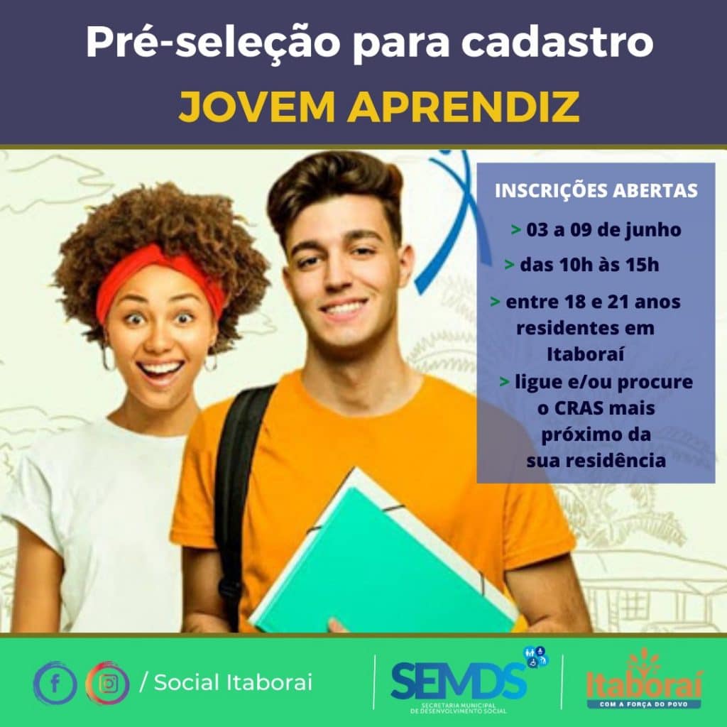 Ainda estão abertas as inscrições para pré-seleção de Jovem Aprendiz. As vagas são destinadas para jovens com idade entre 18 e 21 anos residentes em Itaboraí. O prazo para inscrição vai até a próxima terça-feira, 09 de junho, das 10h às 15h.