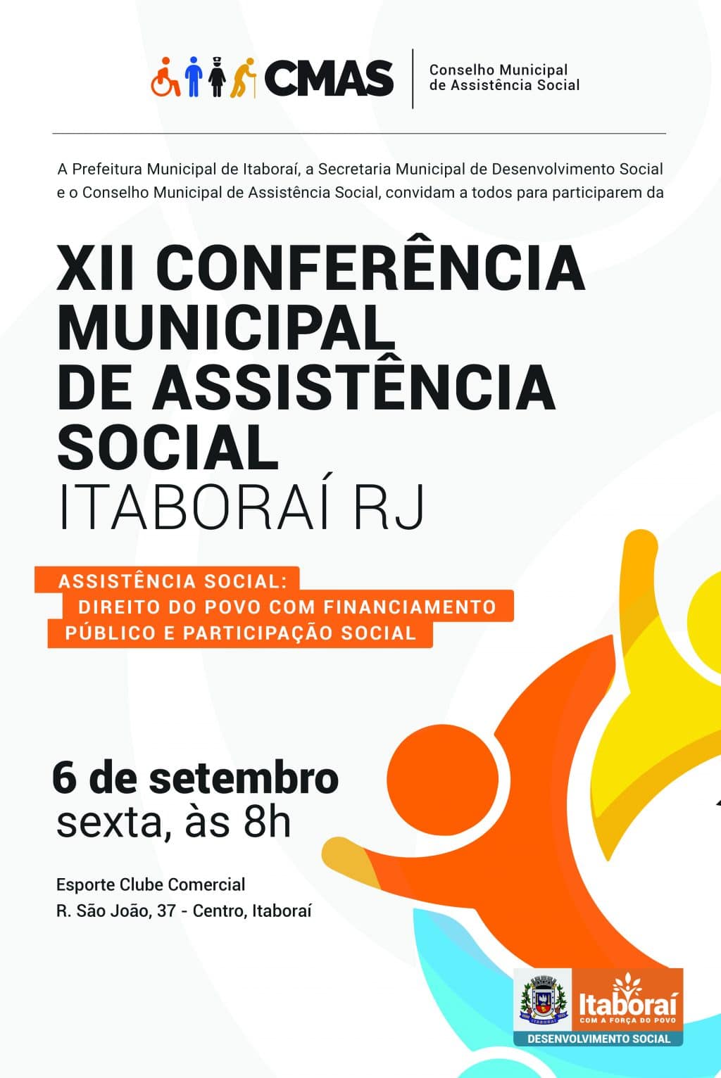 A Secretaria Municipal de Desenvolvimento Social juntamente com o Conselho Municipal de Assistência Social realizará na próxima sexta-feira (06/09), às 8h, no Esporte Clube Comercial, a 12ª Conferência Municipal de Assistência Social de Itaboraí. A ação tem como objetivo discutir as políticas de assistência social no município.