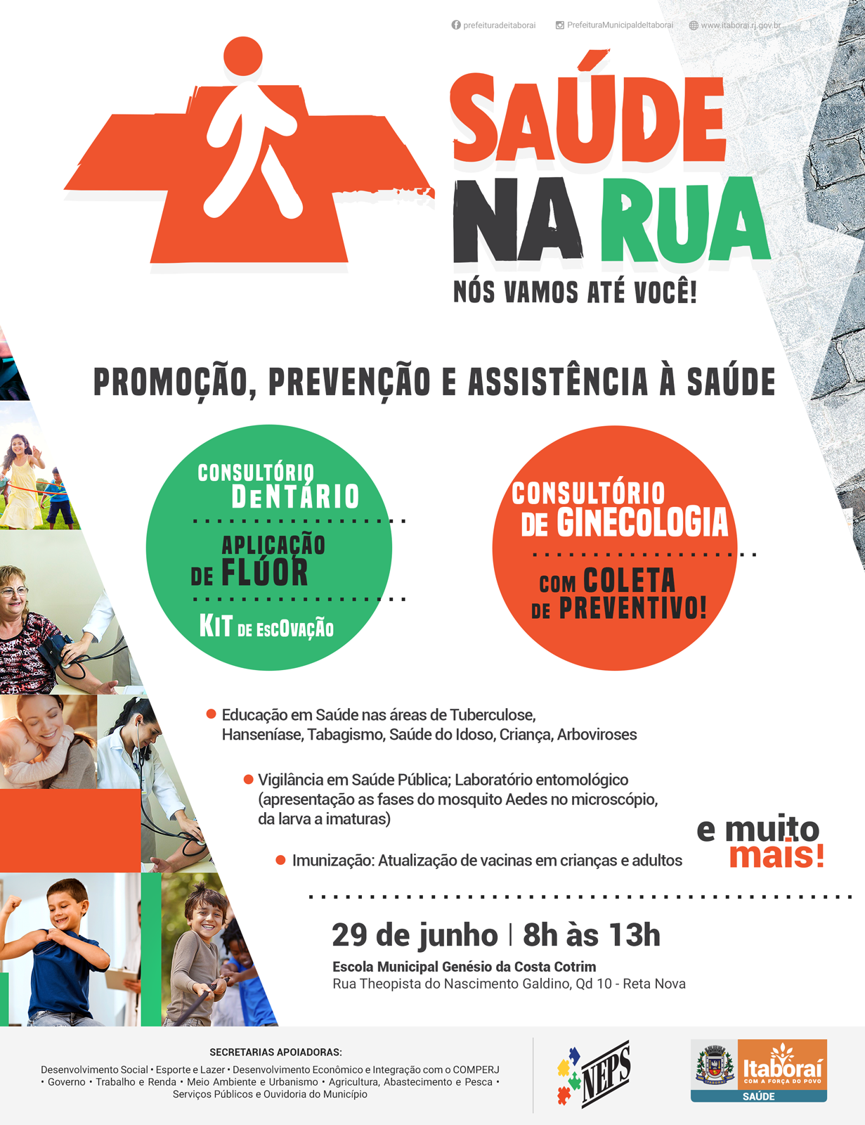 A Prefeitura de Itaboraí convida a população para participar da 3ª edição do ‘Saúde na Rua’, que irá acontecer neste sábado (29/06), das 8h às 13h, no Bairro Esperança.