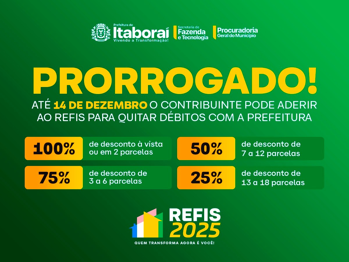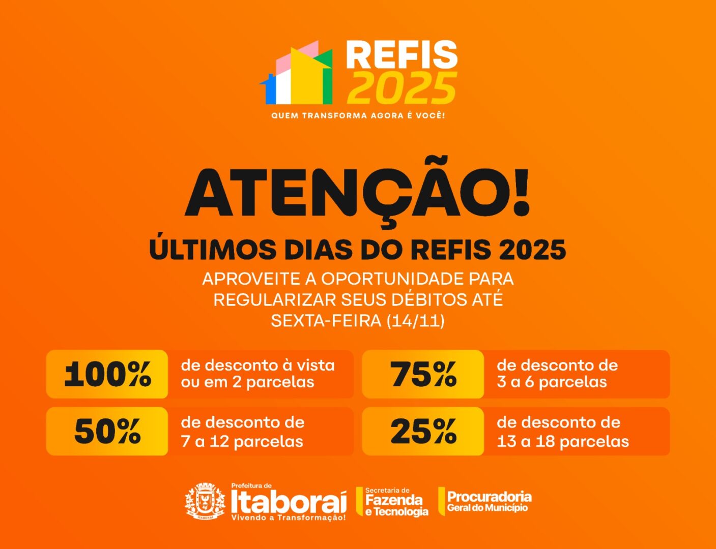 A Prefeitura de Itaboraí, por meio da Secretaria Municipal de Fazenda e Tecnologia, realizará neste sábado (29/11), um atendimento especial do REFIS 2025, das 8h às 14h, para os contribuintes que desejam regularizar suas pendências financeiras com condições facilitadas.
