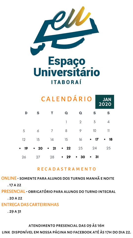 A Prefeitura de Itaboraí, por meio do Espaço Universitário (EU), gerido pela Chefia de Gabinete realizará no próximo dia 17 de janeiro (sexta-feira) até o dia 22 de janeiro, o recadastramento dos usuários do Transporte Universitário para o primeiro semestre de 2020. O recadastro ocorrerá através do link disponibilizado na página oficial do facebook do EU, a partir das 18h do dia 17.
