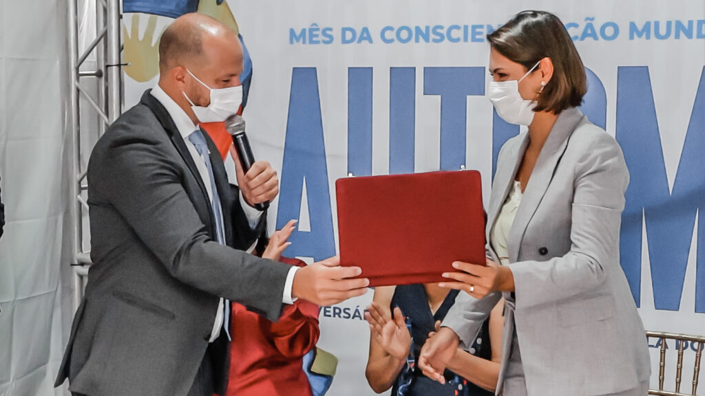 O chefe do Executivo também realizou a entrega de uma placa de homenagem para a fundadora da instituição e idealizadora da lei federal de Proteção aos Direitos da Pessoa com Transtorno do Espectro Autista, Berenice Piana, e outra para primeira-dama, Michelle Bolsonaro.
