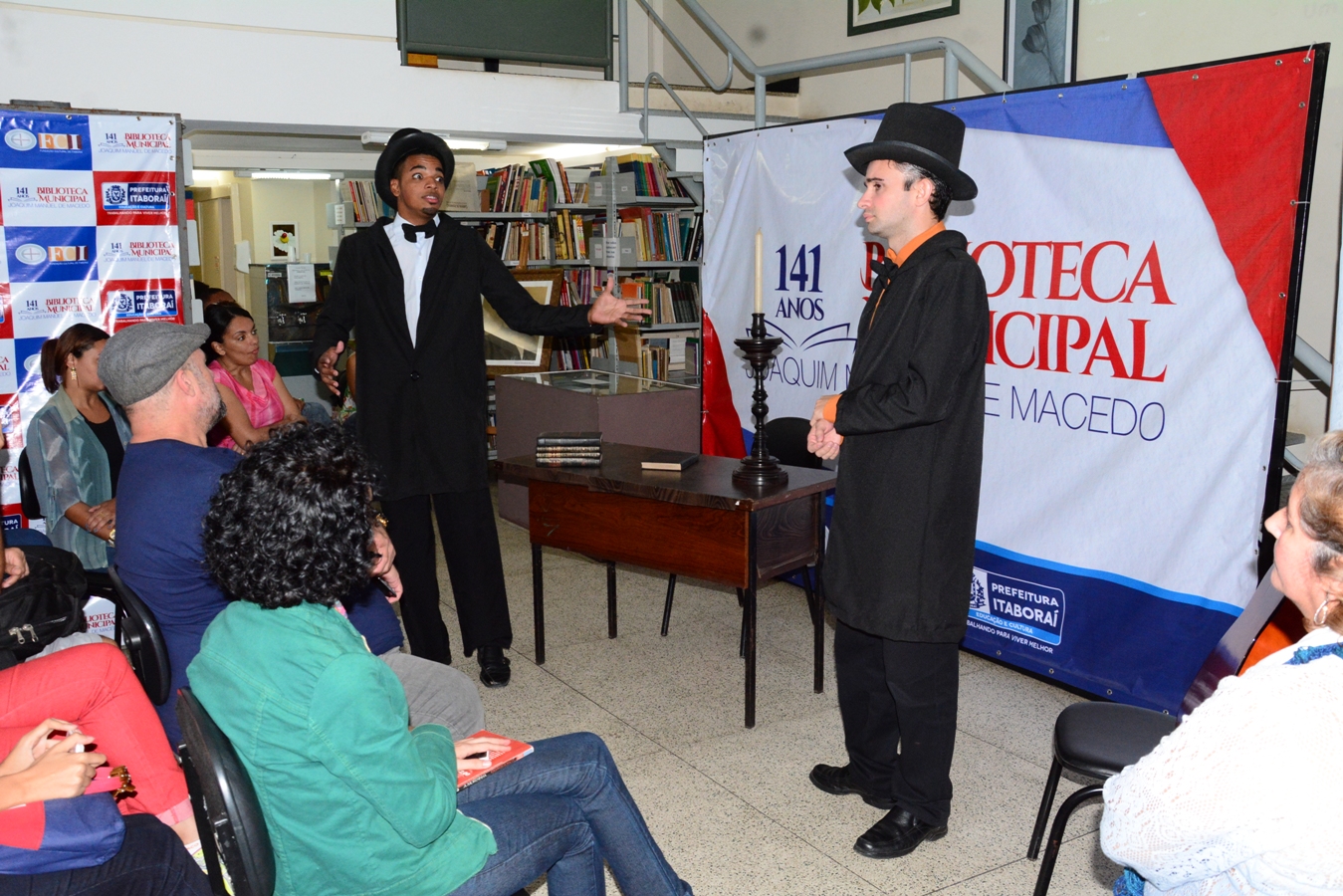 O cenário da apresentação foi a própria biblioteca, em funcionamento no Centro de Itaboraí. Ela foi a primeira unidade pública do gênero no país, fundada pelo próprio Joaquim, há 141 anos. Foi nesse local, que remete ao século 19, que Anderson Luiz, 33 anos e Marcelo Junior, de 20, reviveram dois dos maiores expoentes da literatura brasileira.