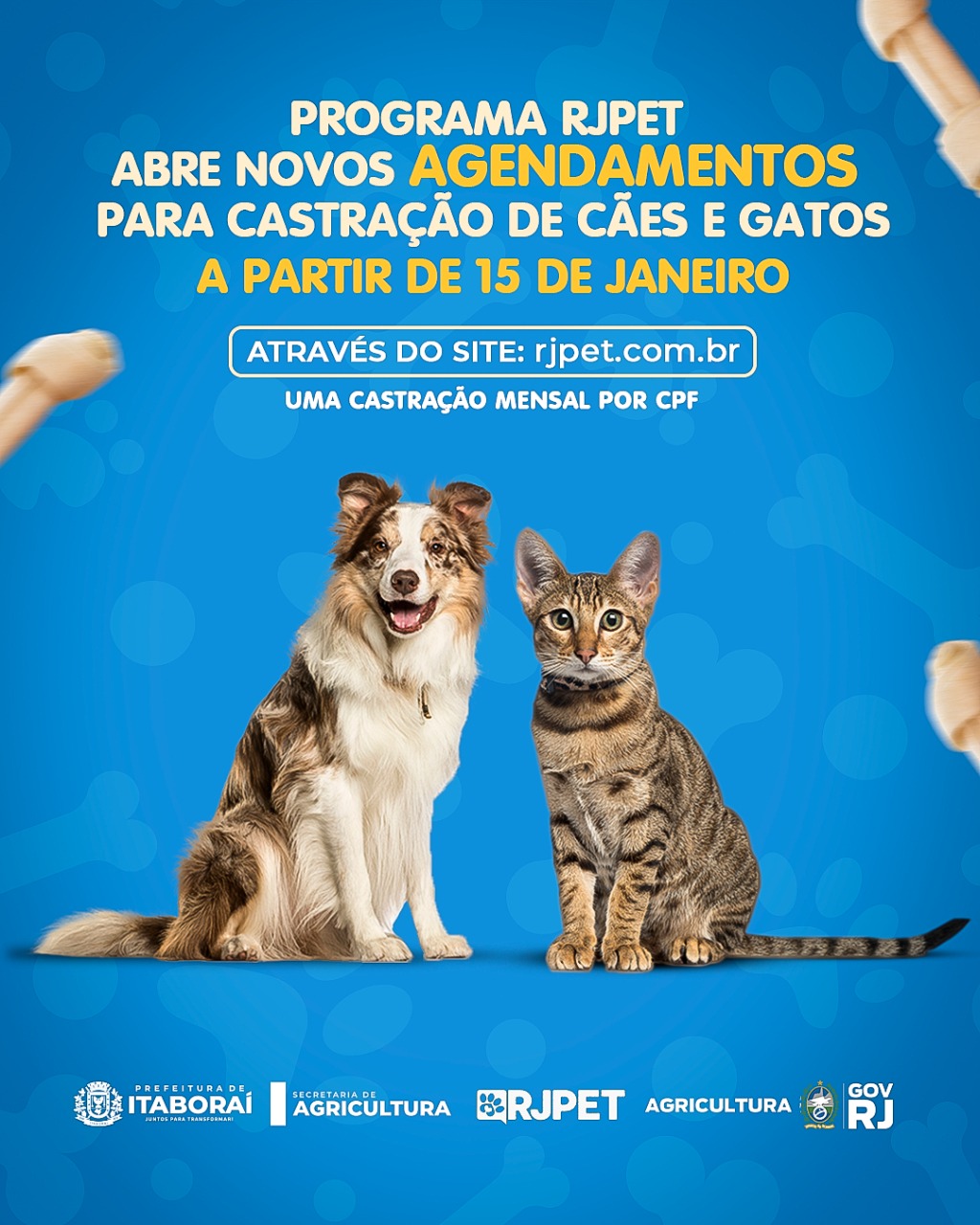 Entre os meses de outubro e dezembro de 2022, foram realizadas mais de 1.300 castrações de cães e gatos no município, graças a um convênio da Secretaria Municipal de Agricultura (SEMAGRI) com o Governo do Estado. O programa RJPET oferece castrações gratuitas após agendamento pelo endereço eletrônico: rjpet.com.br. Novos agendamentos serão abertos a partir do próximo dia 15 de janeiro.