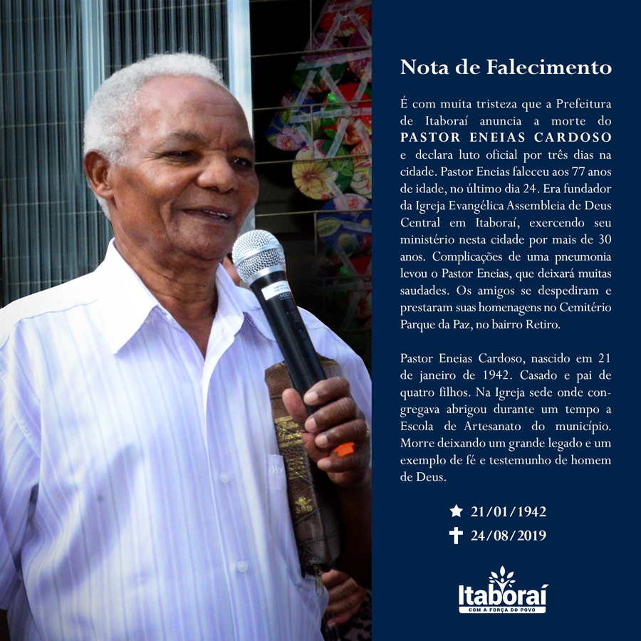 É com muita tristeza que a Prefeitura de Itaboraí anuncia a morte do Pastor Eneias Cardoso e decreta luto oficial por três dias na cidade. Pastor Eneias faleceu aos 77 anos de idade, no último dia 24. Era fundador da Igreja Evangélica Assembleia de Deus Central em Itaboraí, exercendo seu ministério nesta cidade por mais de 30 anos. Complicações de uma pneumonia levou o Pastor Eneias, que deixará muitas saudades. Os amigos se despediram e prestaram suas homenagens no Cemitério Parque da Paz, no bairro Retiro.