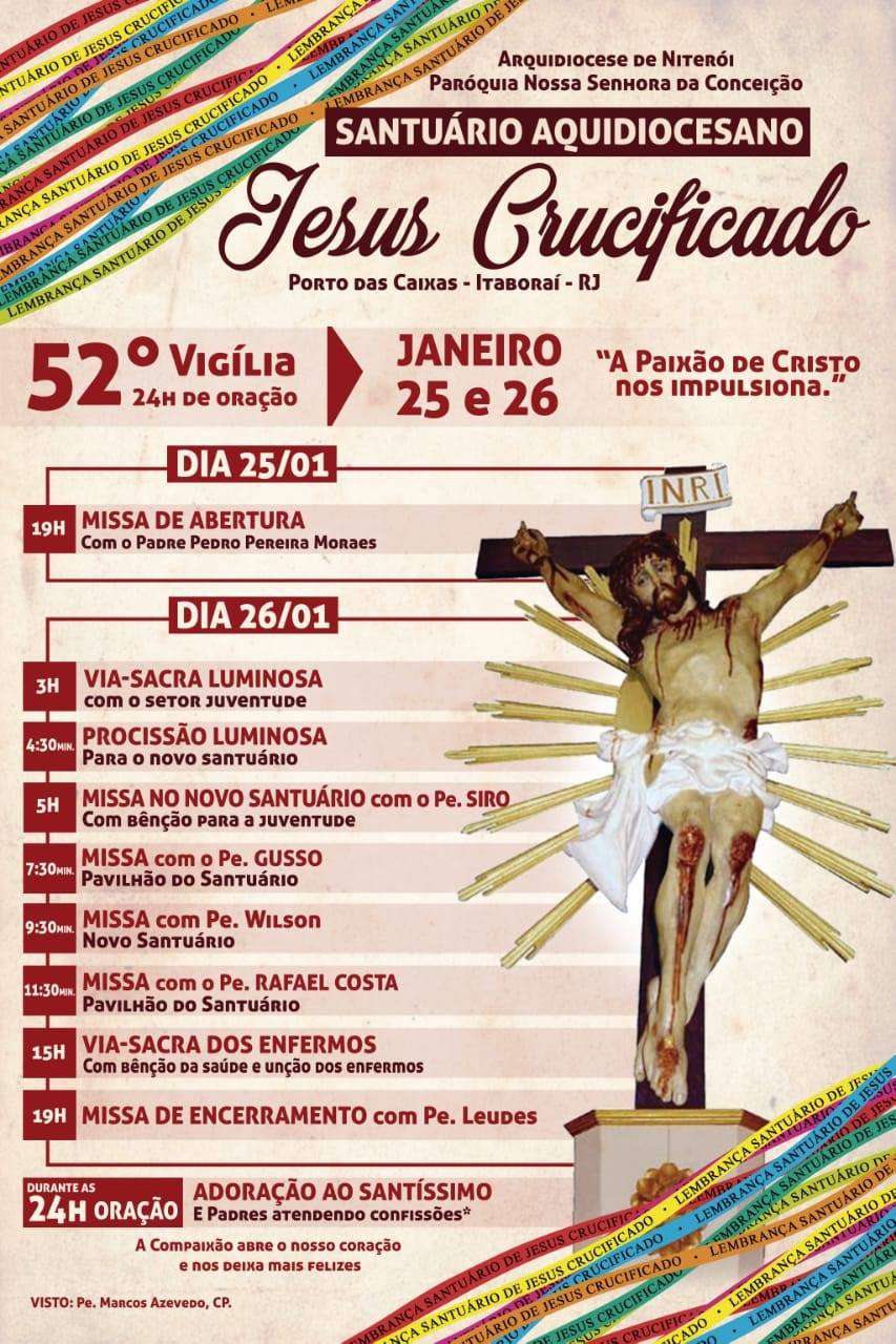 A Arquidiocese de Niterói, por meio da Paróquia Nossa Senhora da Conceição, em Porto das Caixas realizará nos dias 25 e 26 de janeiro (sábado e domingo), o aniversário do Santuário de Jesus Crucificado, em comemoração aos 47 anos do milagre da imagem de Jesus Crucificado, que sangrou no Santuário.