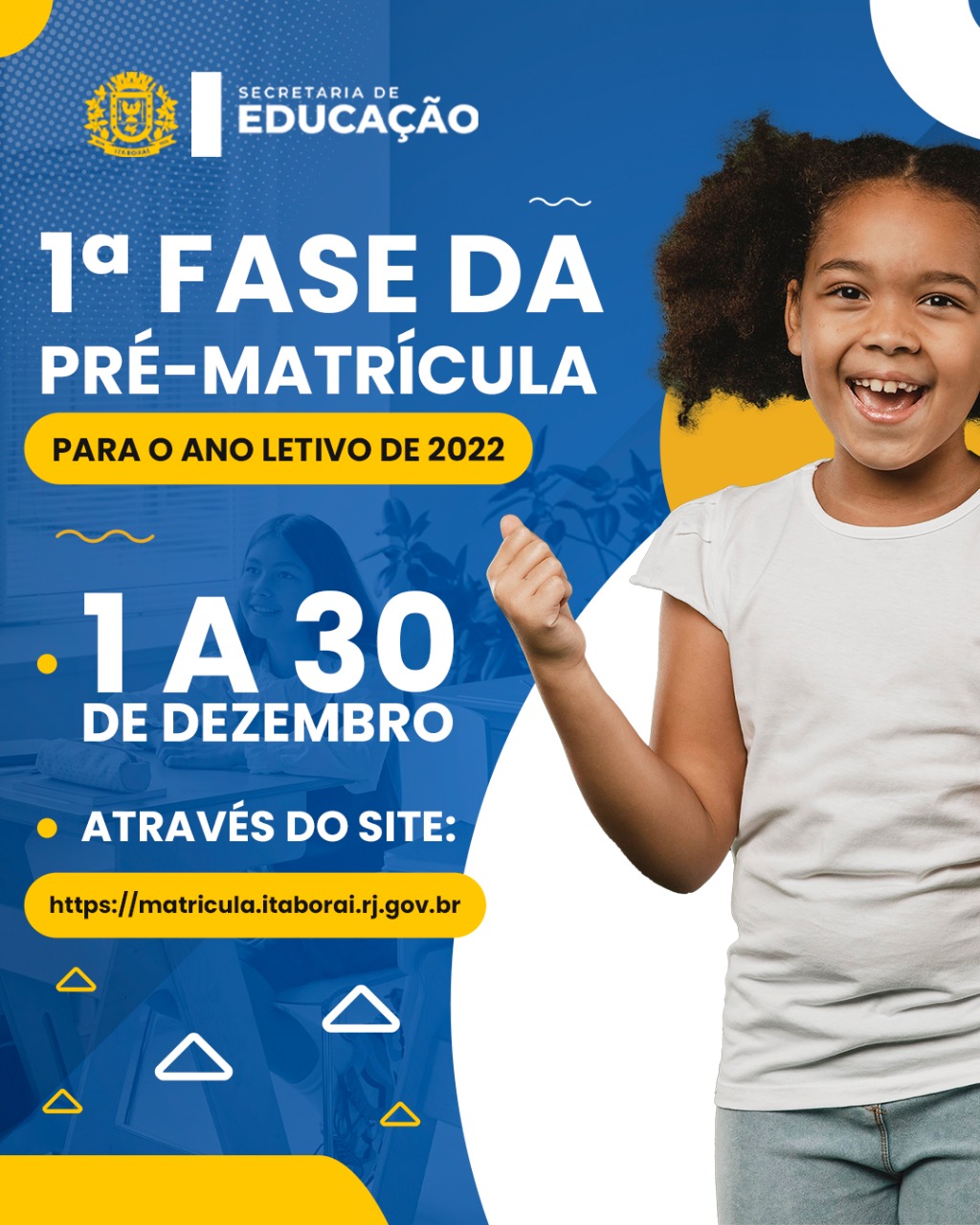 A Secretaria Municipal de Educação (SEMED) inicia, nesta quarta-feira (1º/12), a 1ª fase do período de pré-matrícula das escolas municipais para o ano letivo de 2022 A pré-matrícula para estudantes novos, oriundos de outras redes de ensino e aqueles que desejam iniciar ou retornar à vida escolar vai até o dia 30 de dezembro, por meio do seguinte endereço eletrônico.