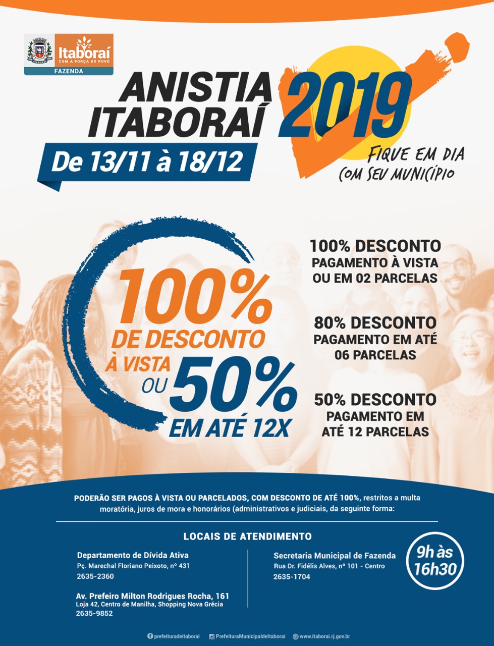 A Prefeitura Itaboraí, por meio da Procuradoria Geral do Município, em parceria com a Secretaria Municipal de Fazenda, iniciou na última quarta-feira (13/11), até o dia 20 de dezembro o Programa de Incentivo à Regularização Fiscal (Anistia Itaboraí 2019) para o pagamento de dívidas em atraso de IPTU, ISS e TAXAS.