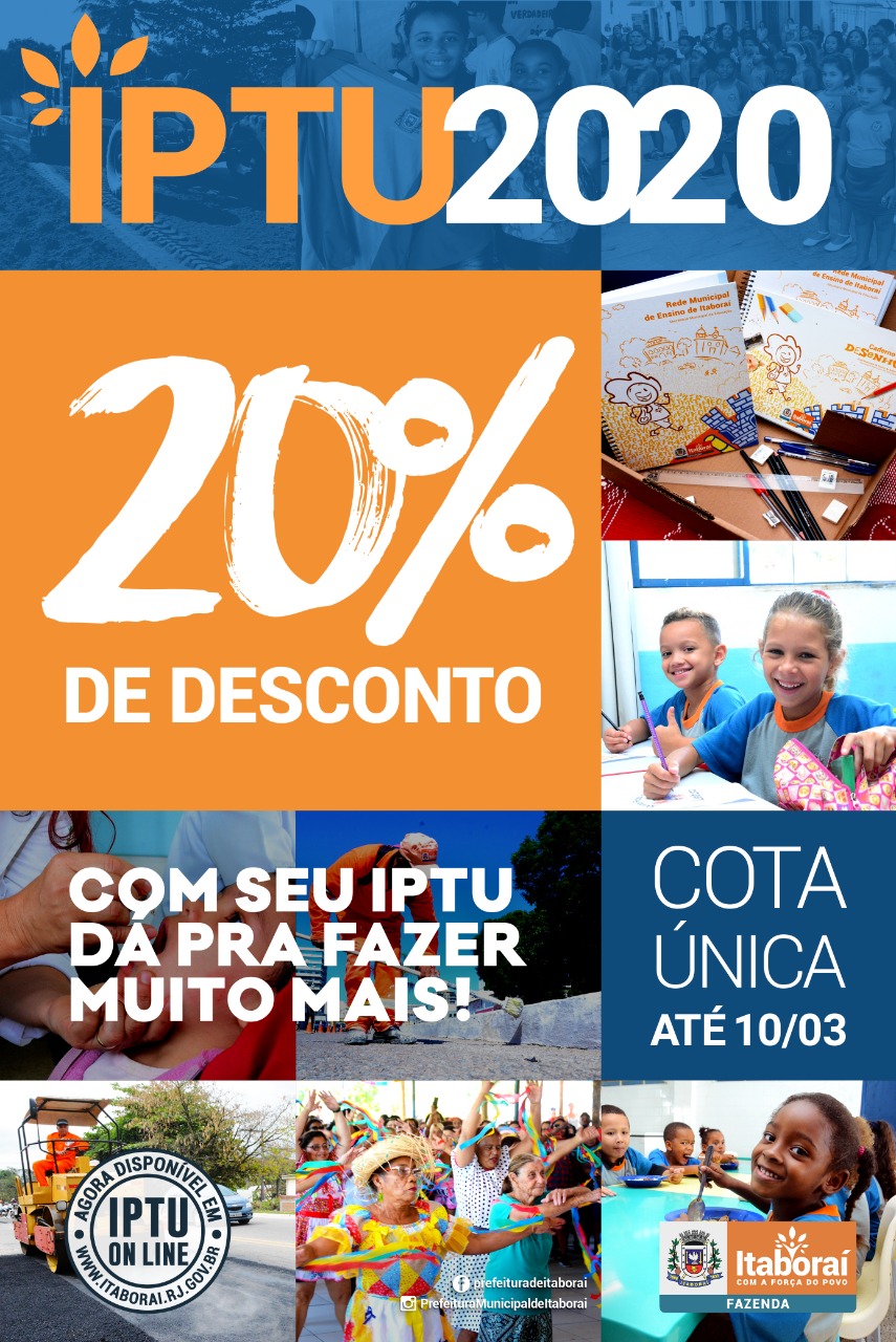 A Prefeitura de Itaboraí, por meio da Secretaria Municipal de Fazenda está disponibilizando desconto de 20% para pagamento em cota única até o dia 10 de março, sobre o Imposto Predial e Territorial Urbano (IPTU) de 2020.