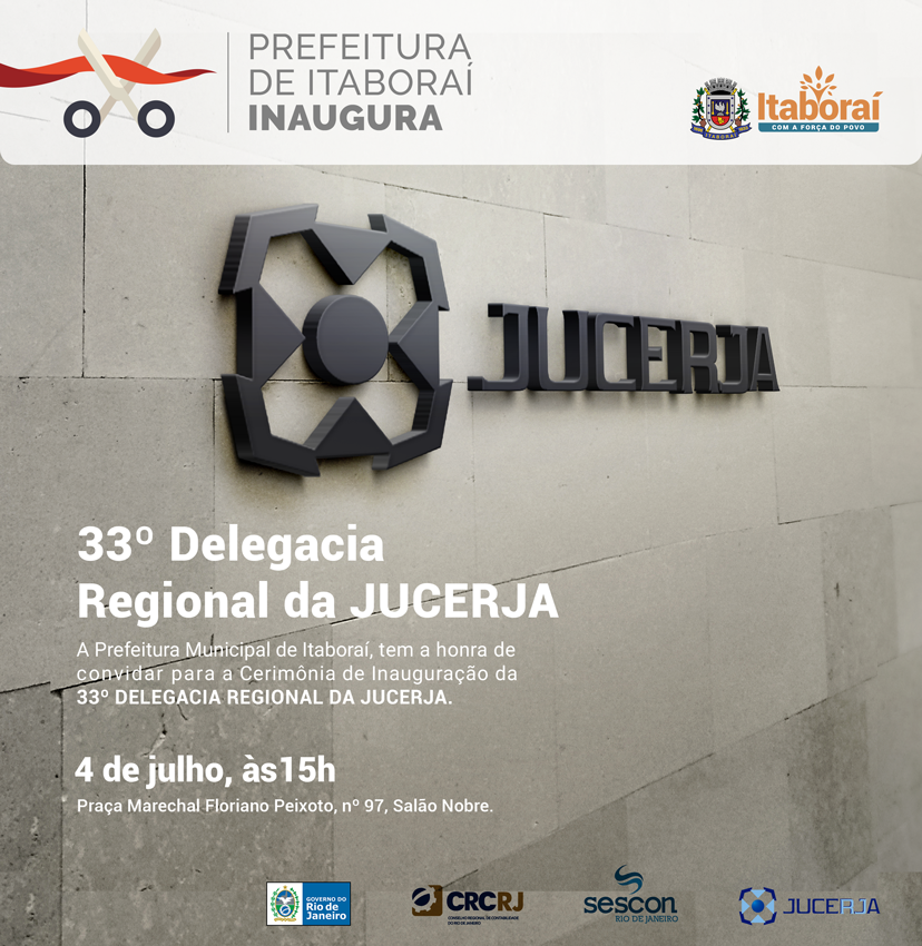 Nesta quinta-feira (04/07), a Prefeitura de Itaboraí, por meio da Secretaria Municipal de Desenvolvimento Econômico e Integração com o Comperj vai inaugurar a 33ª Delegacia da Junta Comercial do Estado do Rio de Janeiro (Jucerja). O evento será realizado no Salão Nobre da Prefeitura de Itaboraí, às 15h.