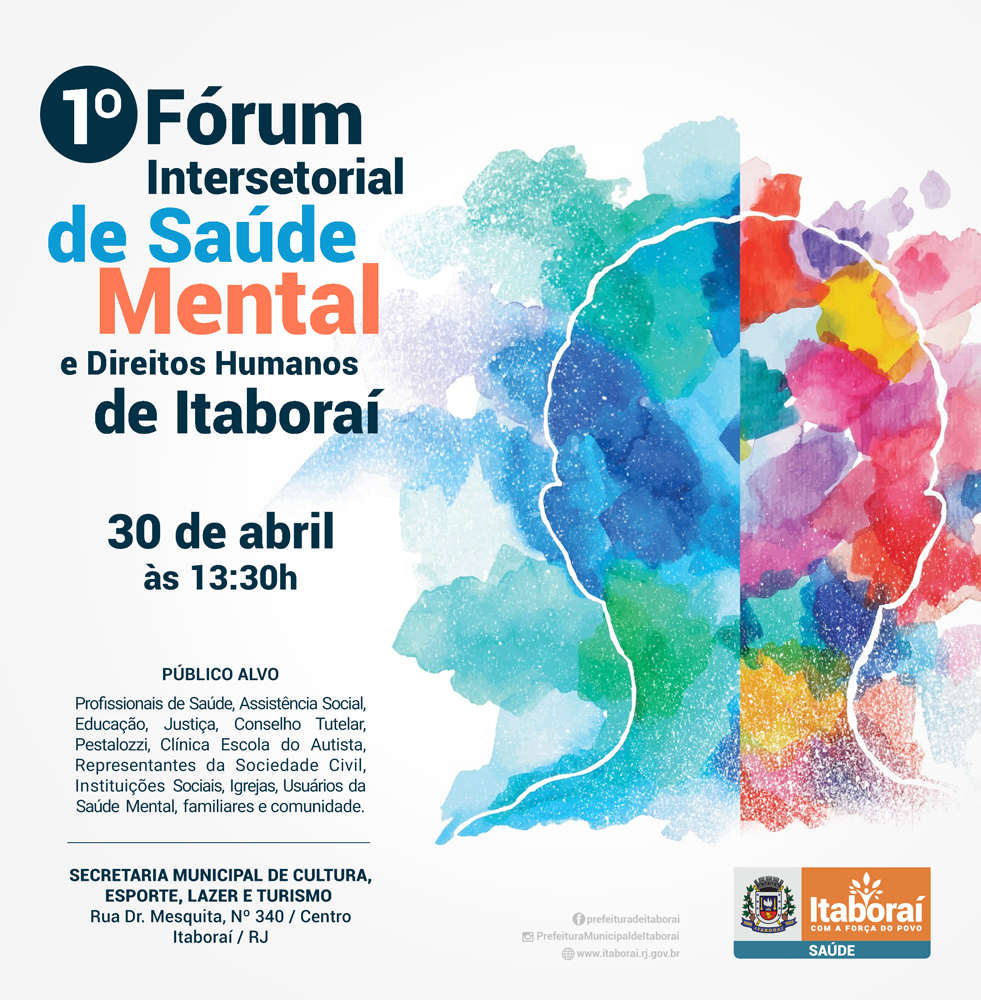 A Secretaria Municipal de Saúde, em parceria com o Programa Municipal de Saúde Mental irá realizar no próximo dia 30 de abril, das 13:30h às 17h, o 1º Fórum Intersetorial de Saúde Mental e Direitos Humanos da cidade.