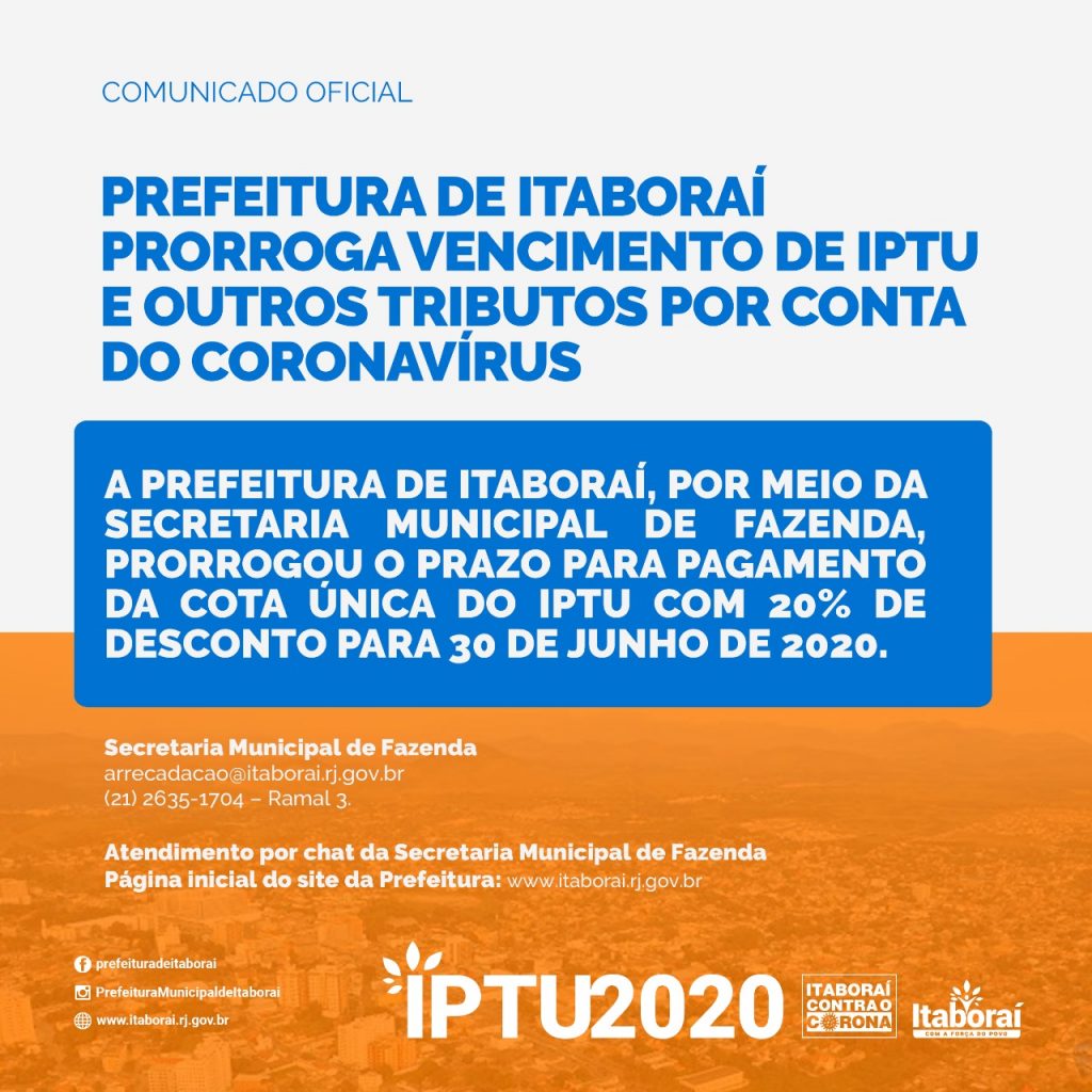A Prefeitura de Itaboraí, por meio da Secretaria Municipal de Fazenda, prorrogou o prazo para pagamento da cota única do IPTU com 20% de desconto para 30 de junho de 2020.