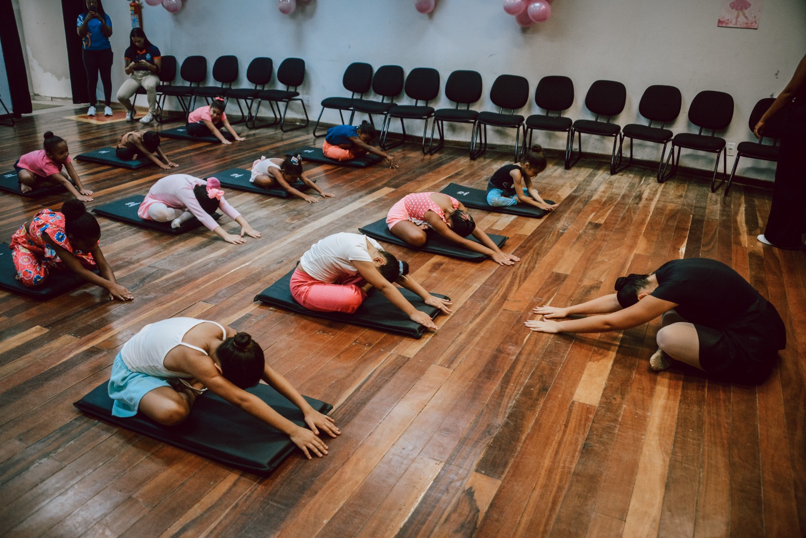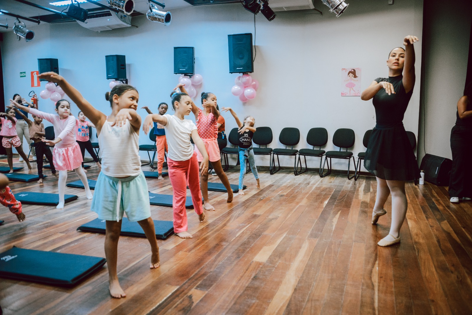 Neste primeiro dia, as alunas participaram de uma aula de iniciação à dança clássica, com alongamentos específicos e exercícios introdutórios voltados à modalidade, com o objetivo de promover a adaptação das crianças ao universo do ballet.