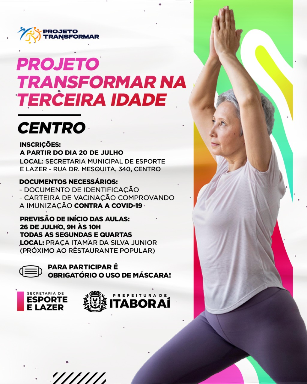 Atendendo aos pedidos da população, o “Projeto Transformar na Terceira Idade” terá um núcleo no centro da cidade. A partir desta terça-feira (20/07), estarão abertas as inscrições para aulas de ginástica, alongamento e circuito funcional para idosos. O programa é uma iniciativa da Prefeitura de Itaboraí, por meio da Secretaria Municipal de Esporte e Lazer (SEMEL).
