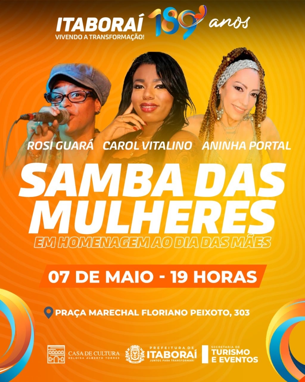 Samba das Mulheres em homenagem ao Dia das Mães na Praça Marechal Floriano Peixoto (2)Para celebrar o Dia das Mães, um encontro musical intitulado de “Samba das Mulheres” será realizado neste sábado (07/05), às 19h, na Praça Marechal Floriano Peixoto, no Centro de Itaboraí. O evento é fruto da parceria da Casa de Cultura Heloísa Alberto Torres com a Secretaria Municipal de Turismo e Eventos.