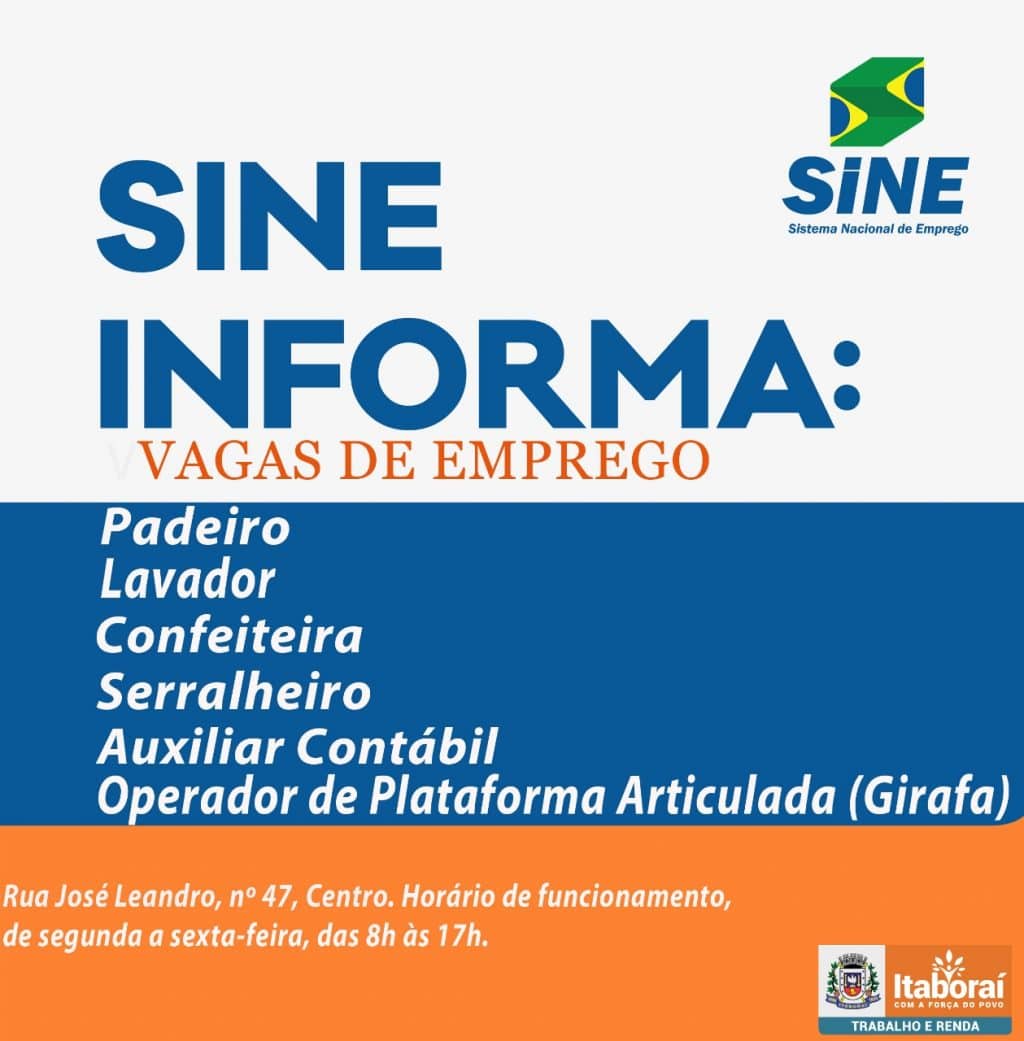O Sistema Nacional de Empregos (Sine) de Itaboraí está com vagas de empregos disponíveis a partir desta quarta-feira (16/10), com contratação imediata. Para se candidatar basta ir à unidade levando as seguintes documentações: RG, Carteira de Trabalho; Comprovante de Residência com o CEP; PIS ou Cartão Cidadão. Além de comprovação de experiência.