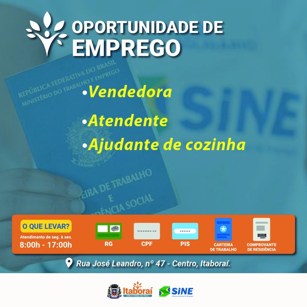 O Sistema Nacional de Empregos (Sine) de Itaboraí está com vagas de empregos disponíveis a partir desta terça-feira (10/03), com contratação imediata. Para se candidatar basta ir à unidade levando as seguintes documentações: RG, Carteira de Trabalho; Comprovante de Residência com o CEP; PIS ou Cartão Cidadão. Além de comprovação de experiência.