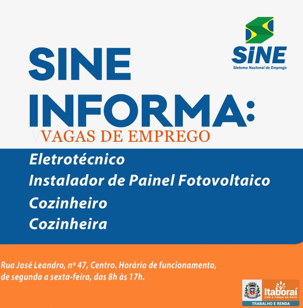 O Sistema Nacional de Empregos (Sine) de Itaboraí está com vagas de empregos disponíveis a partir desta terça-feira (17/09), com contratação imediata. Para se candidatar basta ir à unidade levando as seguintes documentações: RG, Carteira de Trabalho; Comprovante de Residência com o CEP; PIS ou Cartão Cidadão. Além de comprovação de experiência.