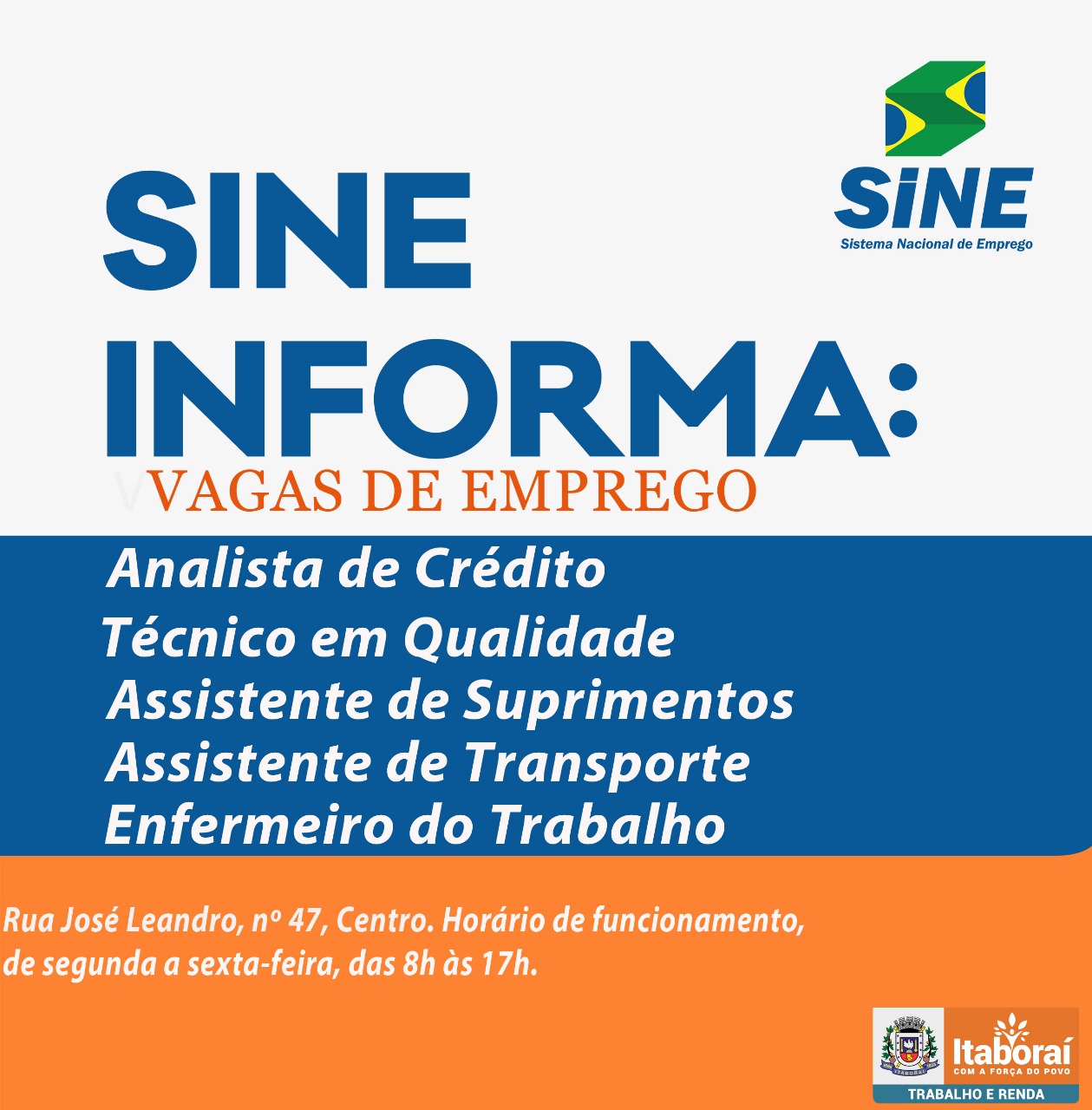 O Sistema Nacional de Empregos (Sine) de Itaboraí está com vagas de empregos disponíveis a partir desta terça-feira (20/08), com contratação imediata. Para se candidatar basta ir à unidade levando as seguintes documentações: RG, Carteira de Trabalho; Comprovante de Residência com o CEP; PIS ou Cartão Cidadão. Além de comprovação de experiência.