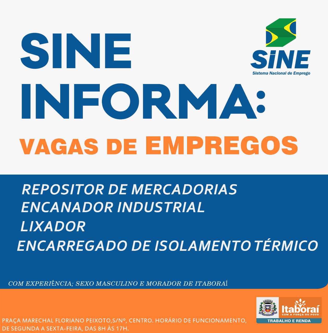 O Sistema Nacional de Empregos (Sine) de Itaboraí está com vagas de empregos disponíveis a partir desta sexta-feira (01/02), com contratação imediata. É necessário que o candidato apresente no mínimo um ano de experiência em uma mesma empresa na função solicitada. Serão consideradas as experiências mais recentes. E caso a função exija certificado é necessário apresentar a documentação original.