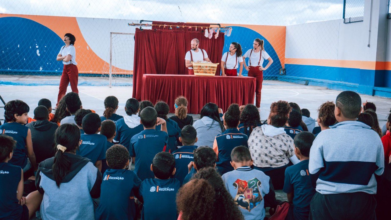 Nesta quarta-feira (11/06), alunos da Escola Municipalizada de Tempo Integral Joaquim Pedro de Andrade – CIEP 452, localizado no bairro Apolo 2, vivenciaram um momento especial de arte, conscientização e informação com a apresentação do espetáculo “Pipo e Fifi”, da Cia. Truks. A ação faz parte do projeto “Escola contra a Violência Infantojuvenil”, promovido em parceria com o Ministério da Cultura e a concessionária Arteris, com patrocínio da Lei Rouanet.