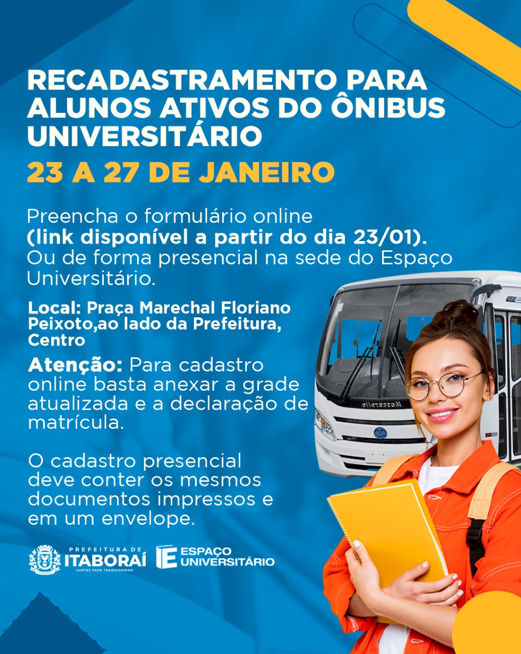 Começa nesta segunda-feira (23/01), o recadastramento dos estudantes que utilizam o Transporte Universitário em Itaboraí para o próximo semestre (2023.1). O universitário deve baixar e preencher o formulário de recadastramento disponibilizado pelo Espaço Universitário. O prazo para solicitar o recadastro vai até o dia 27 de janeiro (sexta-feira).