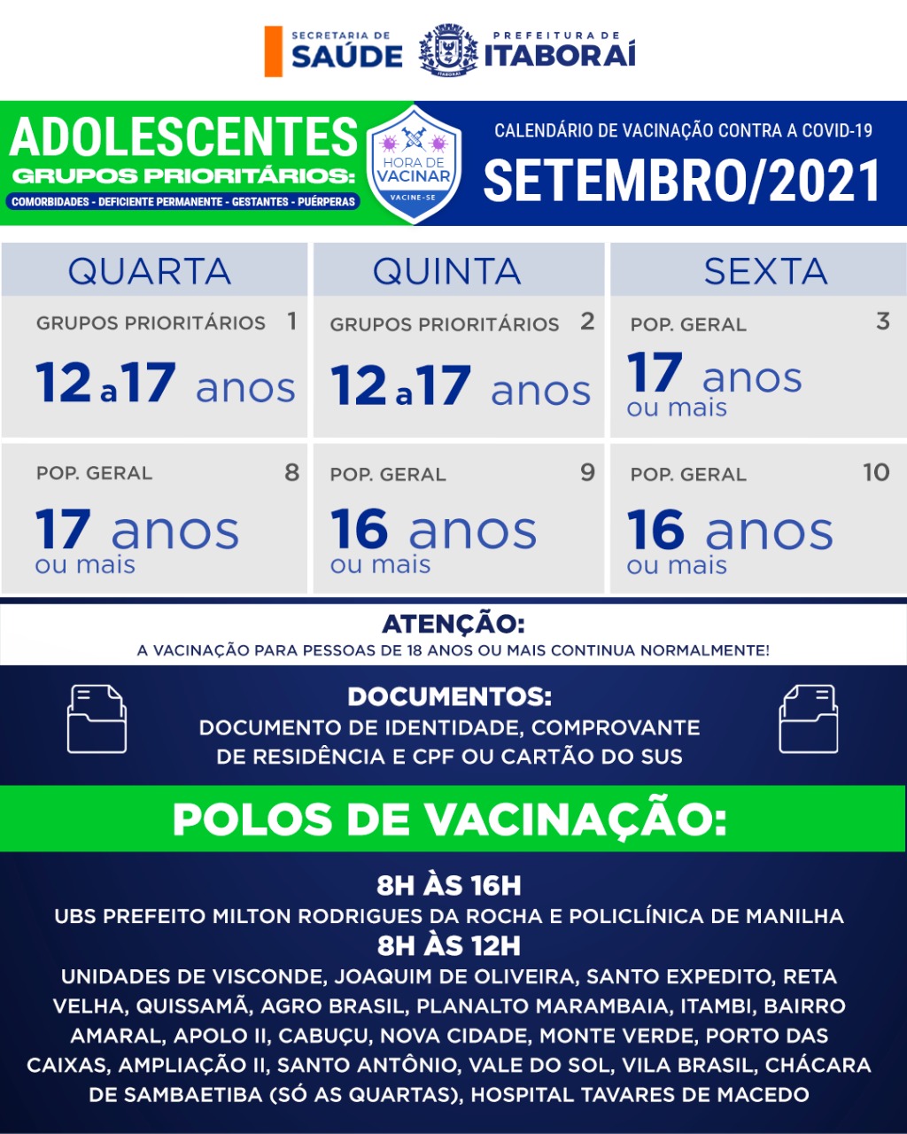 Chegou a vez dos adolescentes garantirem a primeira dose da vacina contra a Covid-19 em Itaboraí. O calendário de vacinação iniciará nesta quarta-feira (1º/09), priorizando inicialmente jovens de 12 a 17 anos com comorbidades ou com deficiência permanente. Ao todo, são 20 polos de imunização estratégicos espalhados pelo município. A Secretaria Municipal de Saúde (SEMSA) ressalta que este planejamento será mantido enquanto durarem os estoques de vacina da Pfizer.